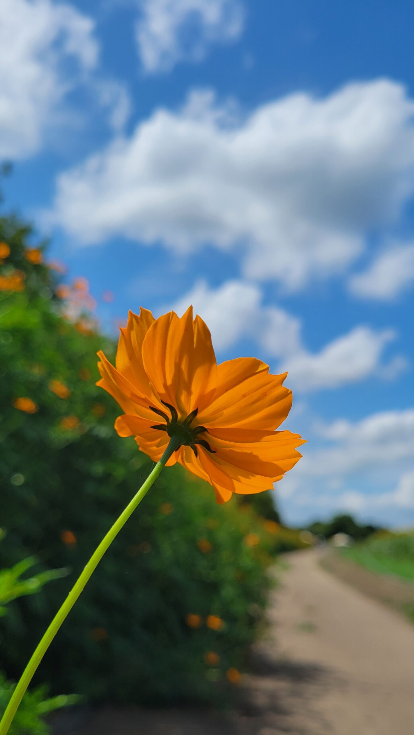 この写真は、幸手権現堂で、ひまわり畑の横に続くキバナコスモス道を、一輪のコスモスを主役にして撮影したものです。幸手権現堂では、夏の終わりから初秋にかけて、小路沿いに鮮やかなキバナコスモスが咲き並びます。オレンジや黄色の花々の間を、アゲハ蝶がひらひらと舞う姿はとても優雅で、まるで季節の絵本から抜け出したよう。花と蝶が織りなす景色は、散策しながらの撮影にもぴったりで、写真愛好家にも人気の被写体です。
