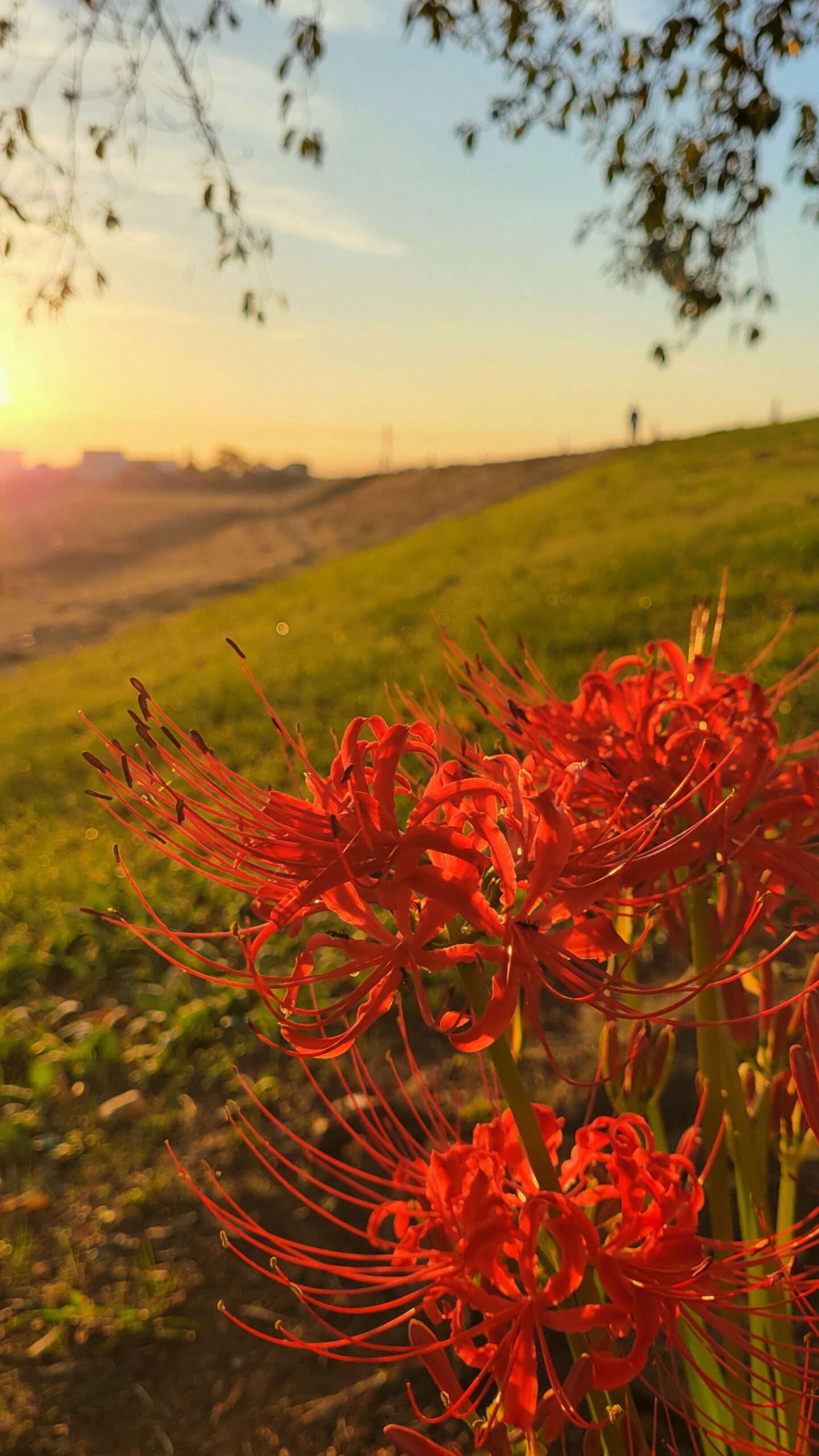 荒川土手|朝露に照らされ曼殊沙華がきらめく夜明けの光景