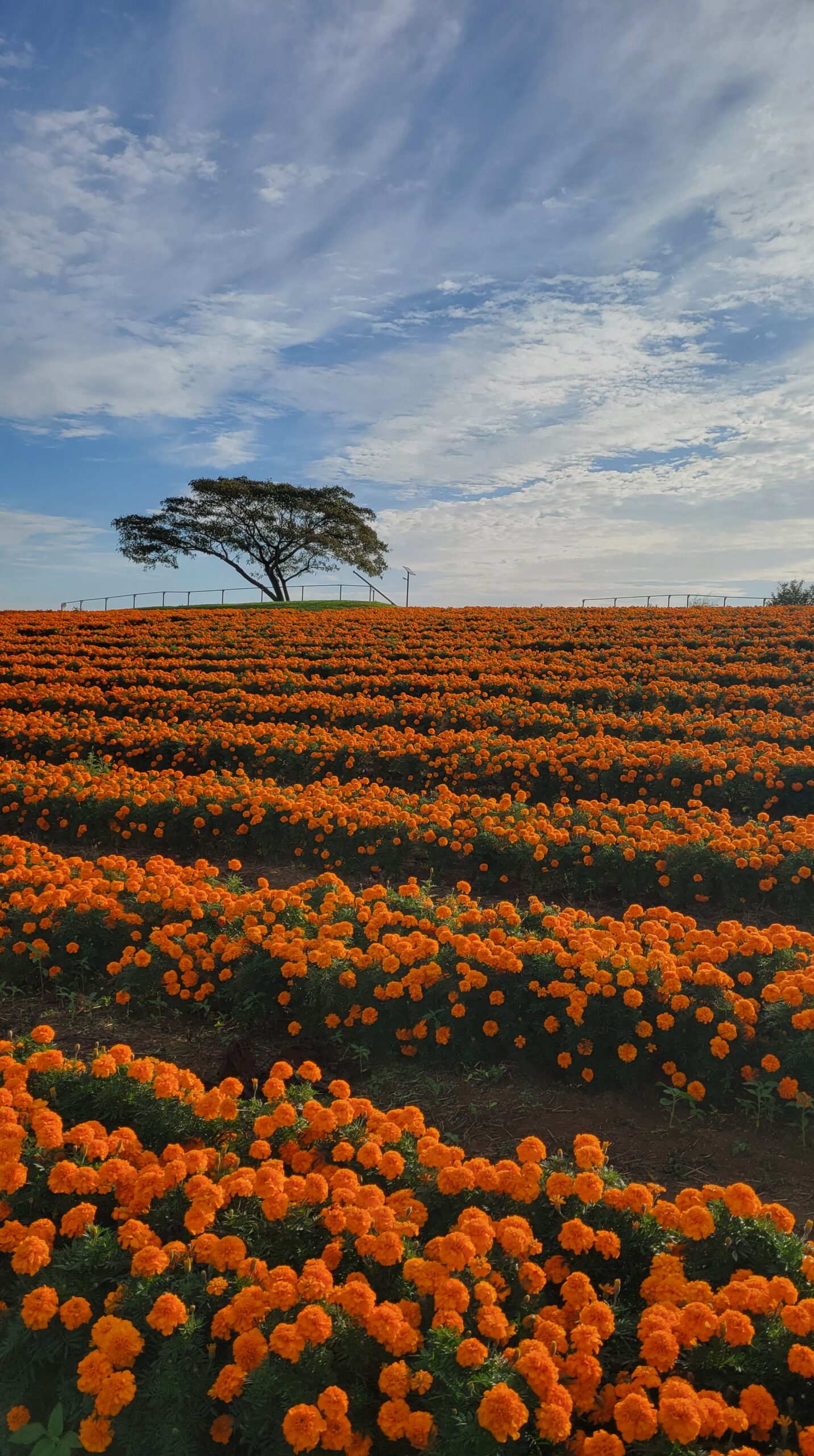 この写真は、マリーゴールドの丘で、下から見上げる形で、一面に咲くマリーゴールドの迫力をとらえ、シンボルの木と一緒に撮影したものです。まるで花の海に包まれるような立体感のある風景が印象的でした。