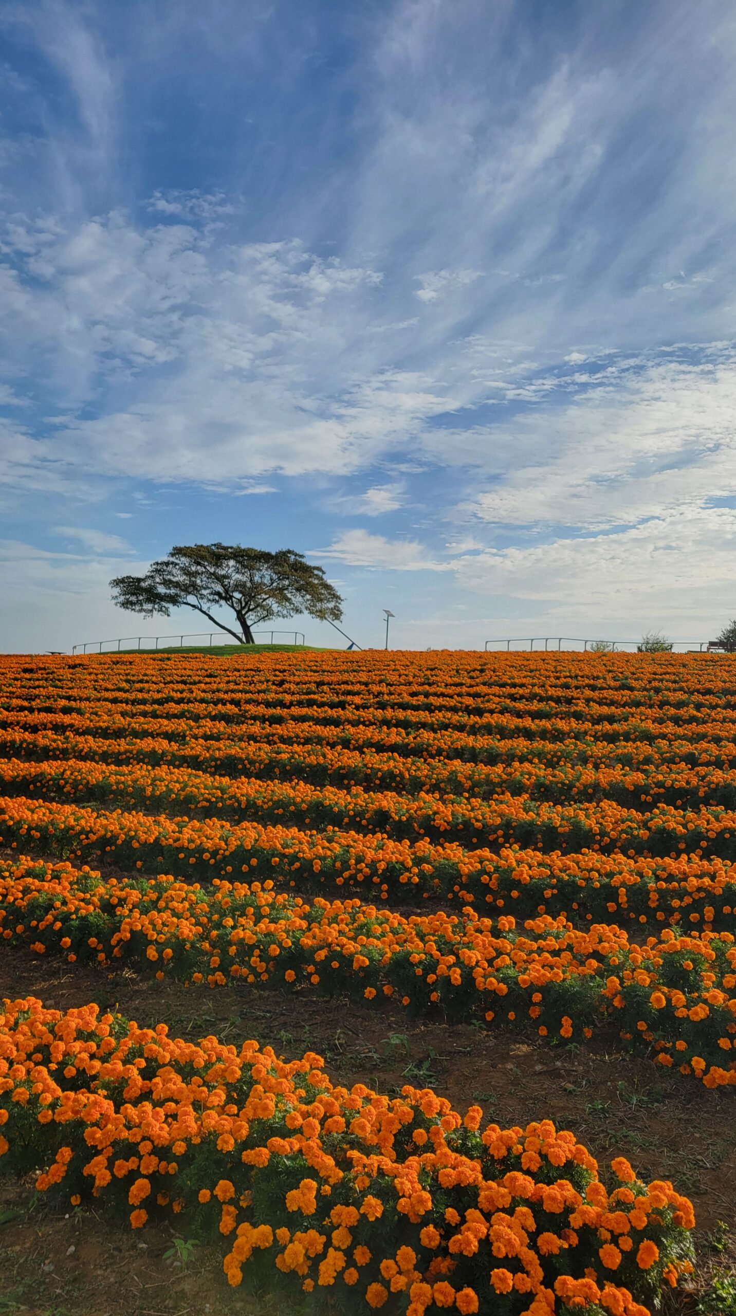 この写真は、マリーゴールドの丘で、段々と続くマリーゴールド畑を下の位置から見上げる形で撮影したものです。花々が層をなすように広がり、立体的なボリューム感を感じさせる構図を意識しました。