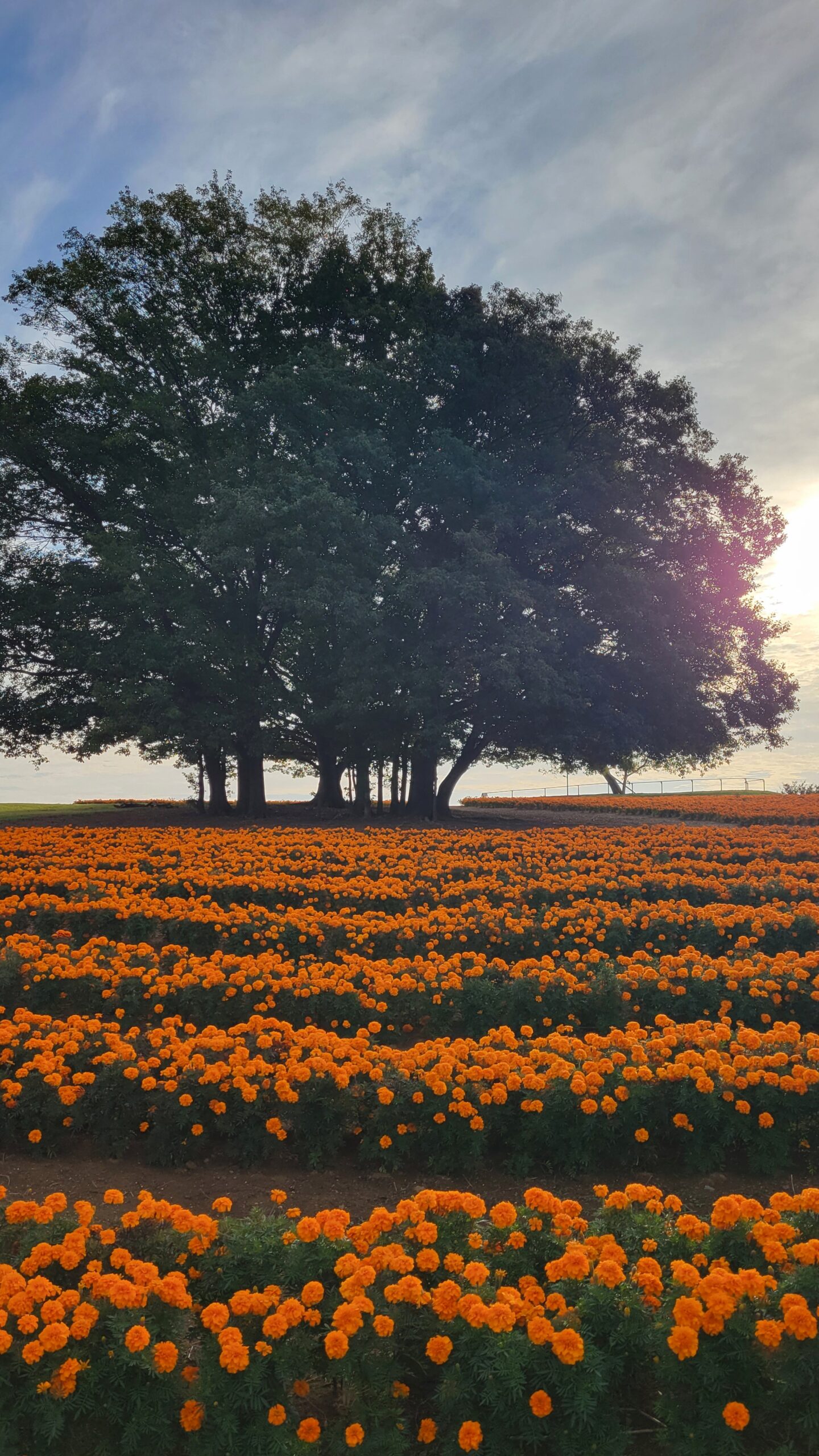 この写真は、マリーゴールドの丘で、奥の低い位置にあるマリーゴールド畑と、大きな木を下から見上げるように撮影したものです。木の存在感と花の鮮やかさが調和し、雄大な風景が広がりました。