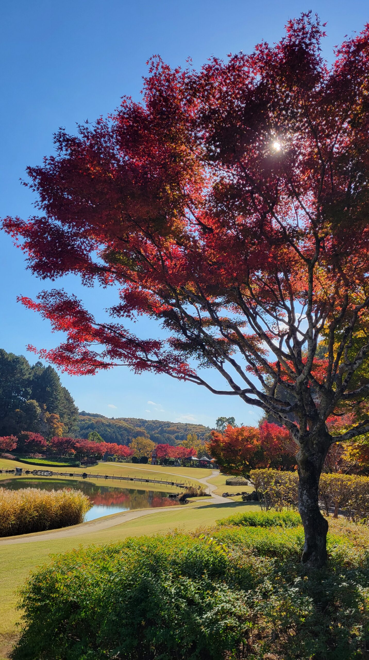 この写真は、笠間芸術の森公園で、青空の下に続くモミジの紅葉を奥まで見渡すように撮影したものです。空の青と紅葉の赤が美しく調和し、爽やかな秋晴れを感じる一枚です。