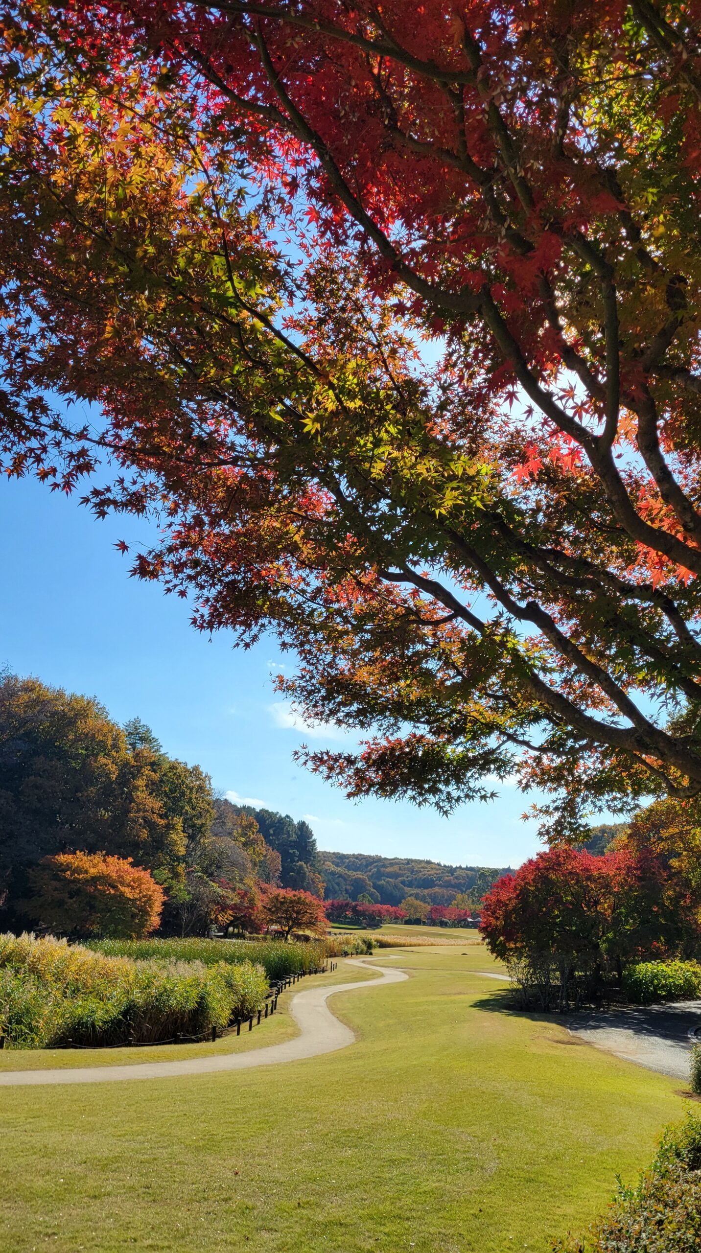 この写真は、笠間芸術の森公園で、紅葉が見事なモミジの木の横から、広場と周囲の紅葉の木々を撮影したものです。奥行きのある景色が広がり、公園の広さを感じさせます。