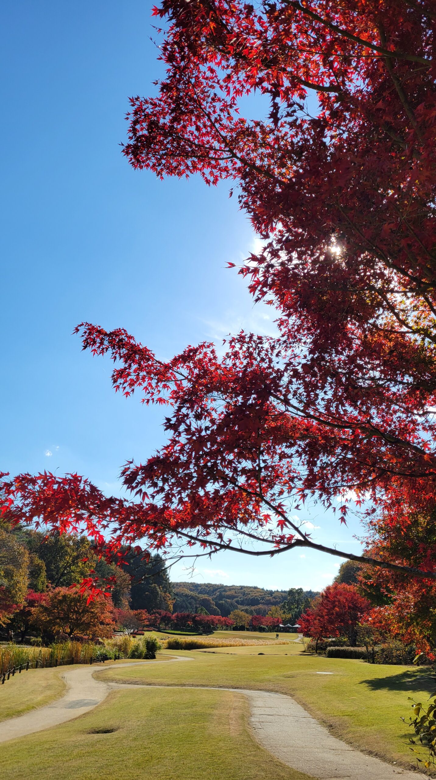 この写真は、笠間芸術の森公園で、真っ赤に染まるモミジの紅葉と、抜けるような青空との美しい対比を撮影したものです。色彩のコントラストが鮮やかで、秋の清々しさを象徴する風景です。
