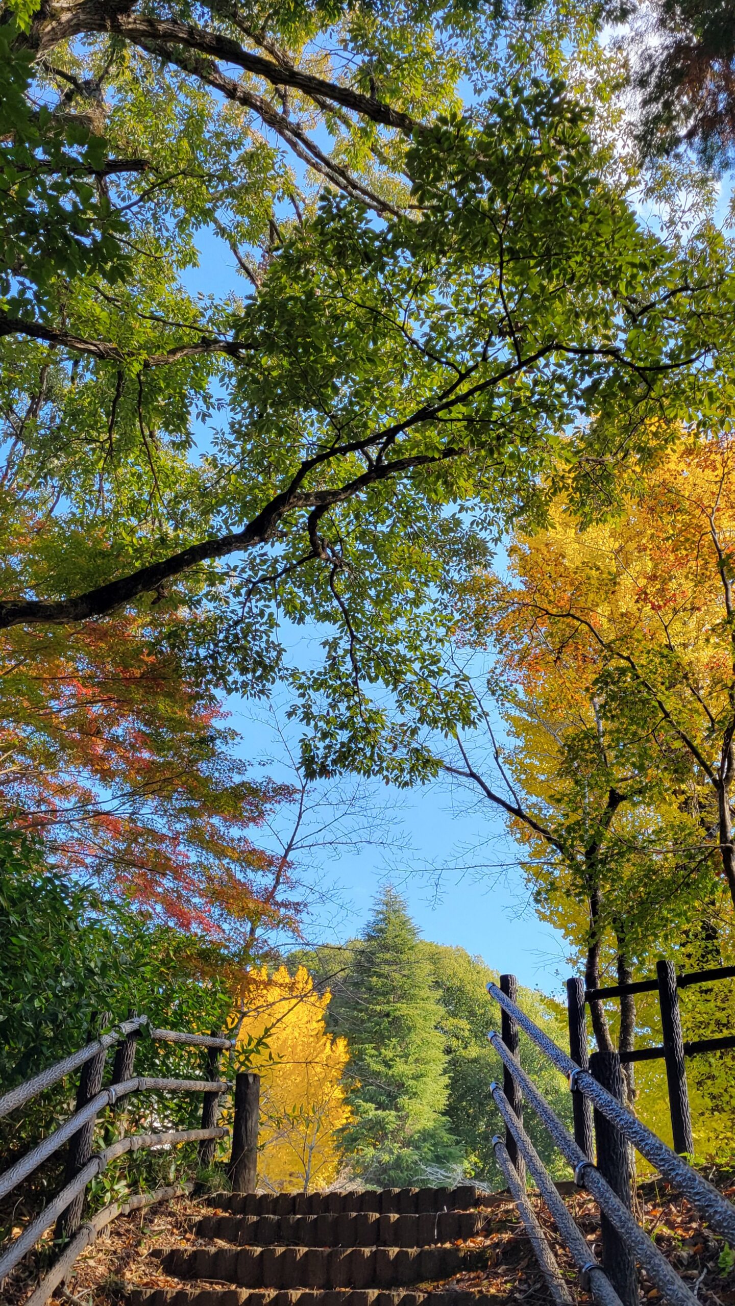 この写真は、佐白山ろく公園(佐白山麓公園)で、階段を上がると目の前にカラフルな紅葉が広がり、まるで秋の入口に立ったような景色を撮影したものです。