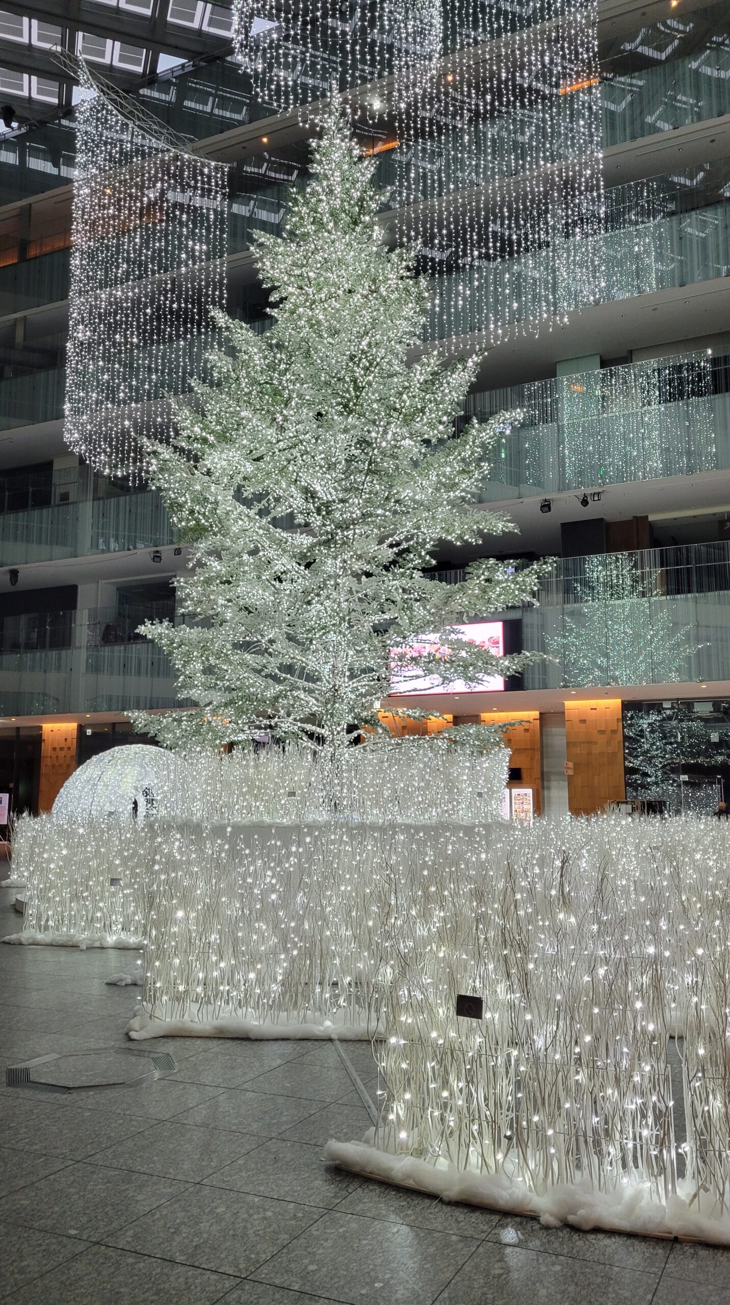 この写真は、WHITE KITTE(ホワイト キッテ)で、早朝の無人の時間にツリーのイルミネーションを通常モードで撮影したものです。落ち着いた構図の中に巨大ツリーの華やかさが際立ち、KITTEならではのクリスマスの空気感が伝わります。