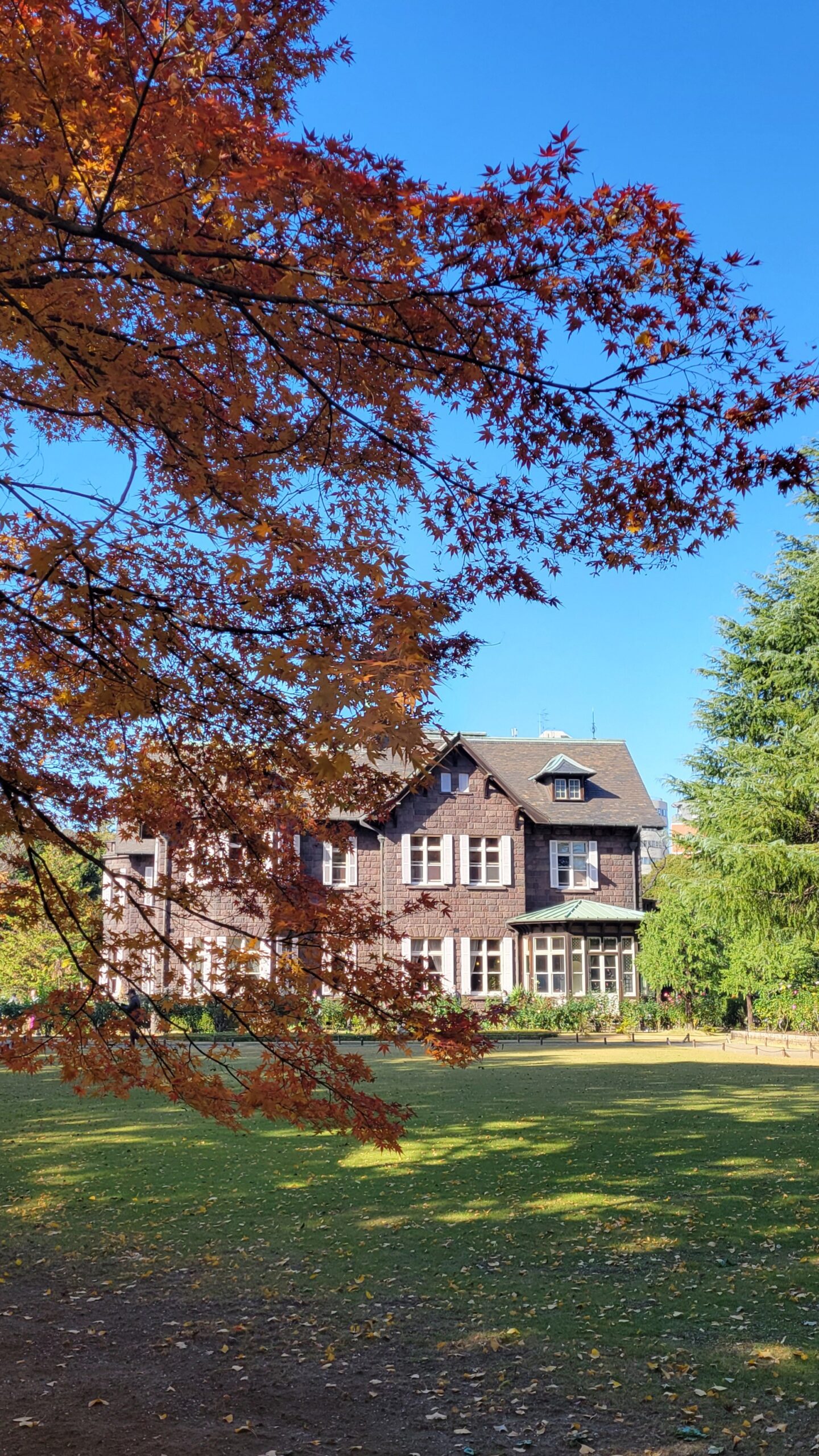 この写真は、旧古河庭園で、モミジの木の下から洋風建築を撮影したものです。紅葉のフレーム越しに見える重厚感ある建物が印象的で、和と洋が交わる雰囲気が魅力的に表現されています。