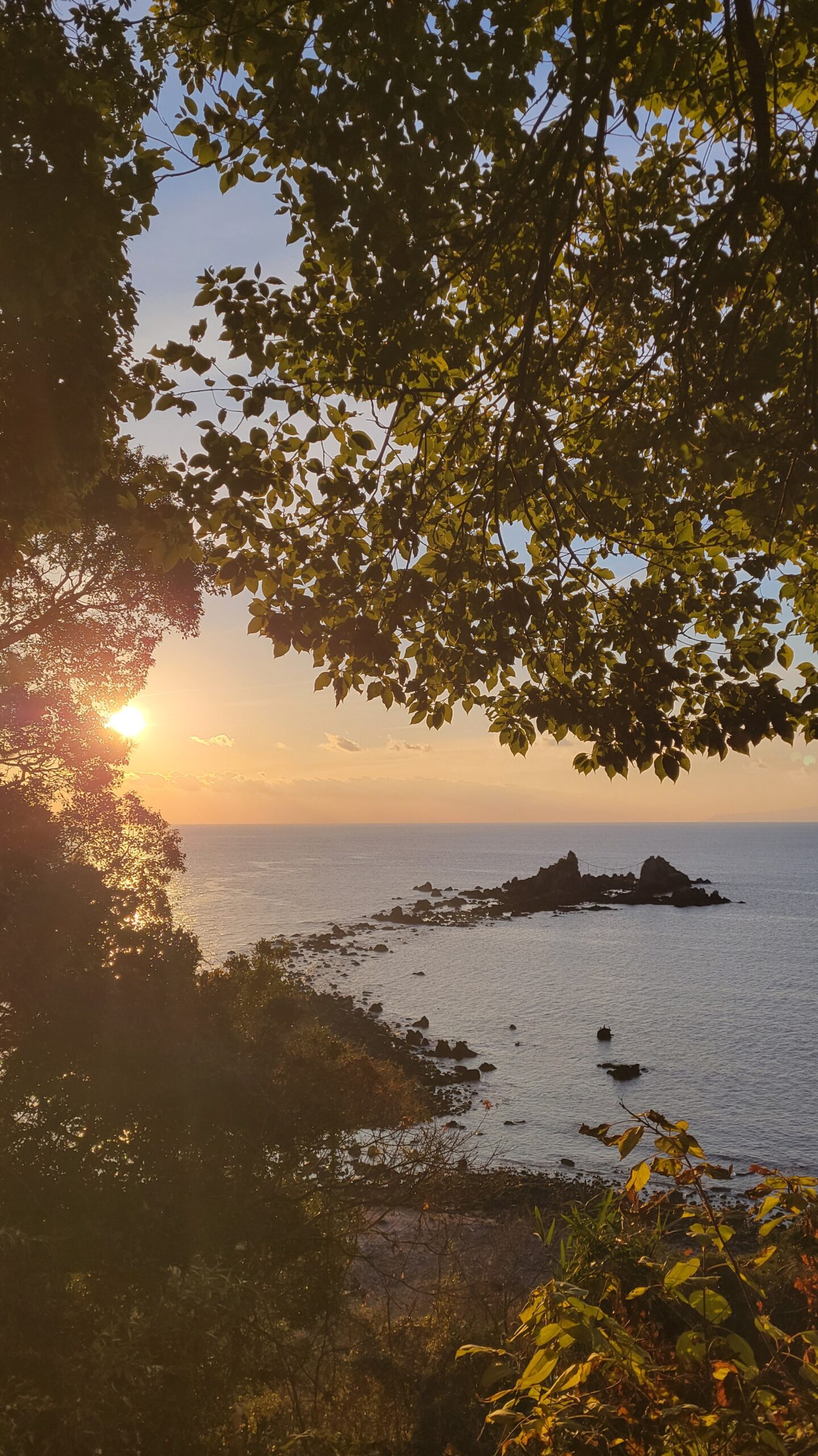 真鶴岬(三ツ石海岸)|木の葉の隙間から見えた朝日と岩