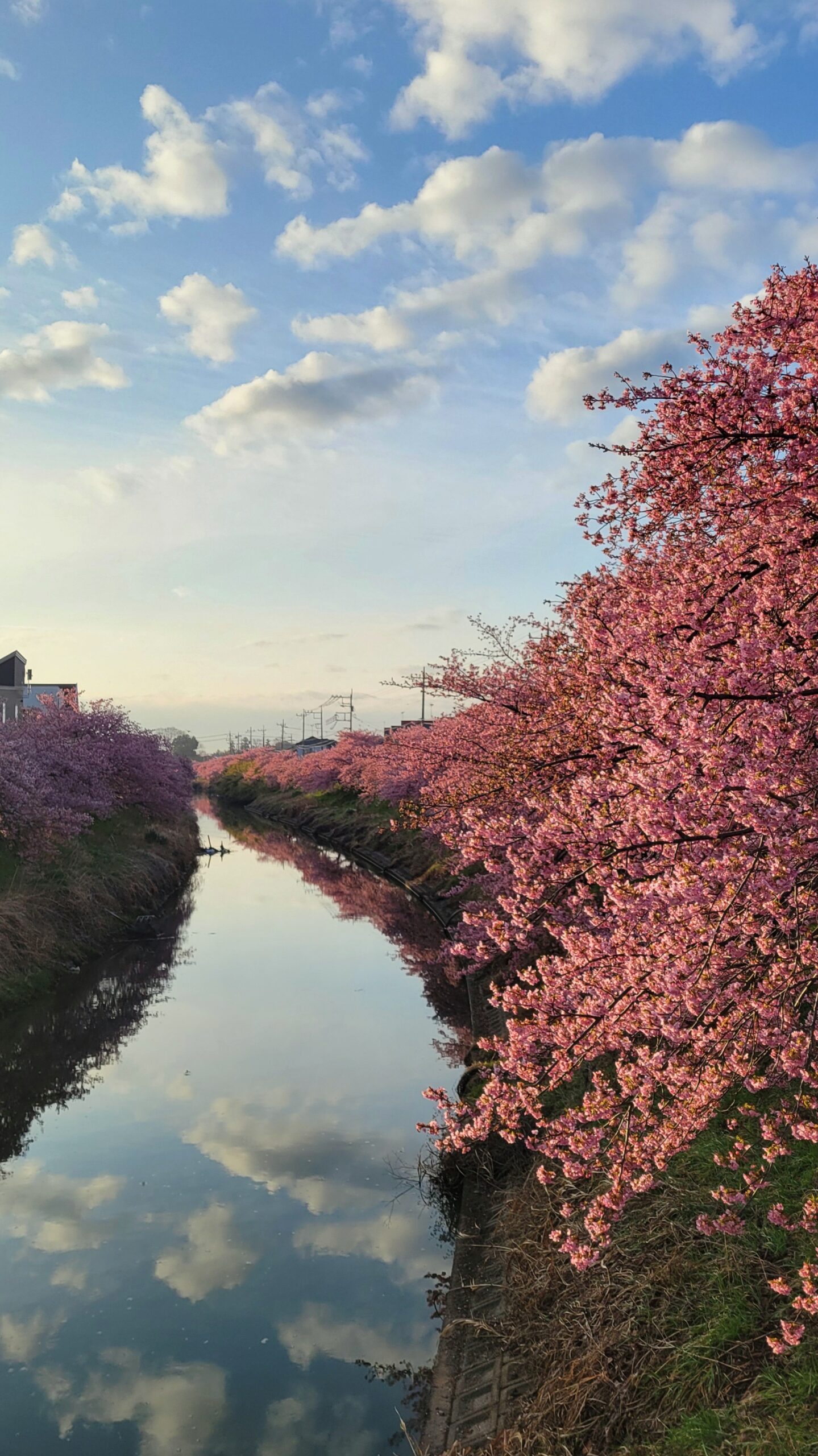 この写真は、青毛堀川で、川沿いに続く桜並木と広がる雲の様子を合わせて撮影し、川辺の春らしい風景と空の広がりを感じられるように構図を整えた一枚です。