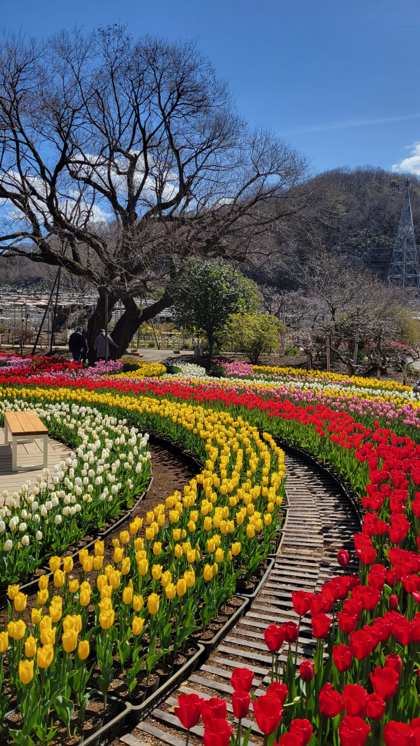 あしかがフラワーパークの白・黄・赤のチューリップが描く曲線の花壇