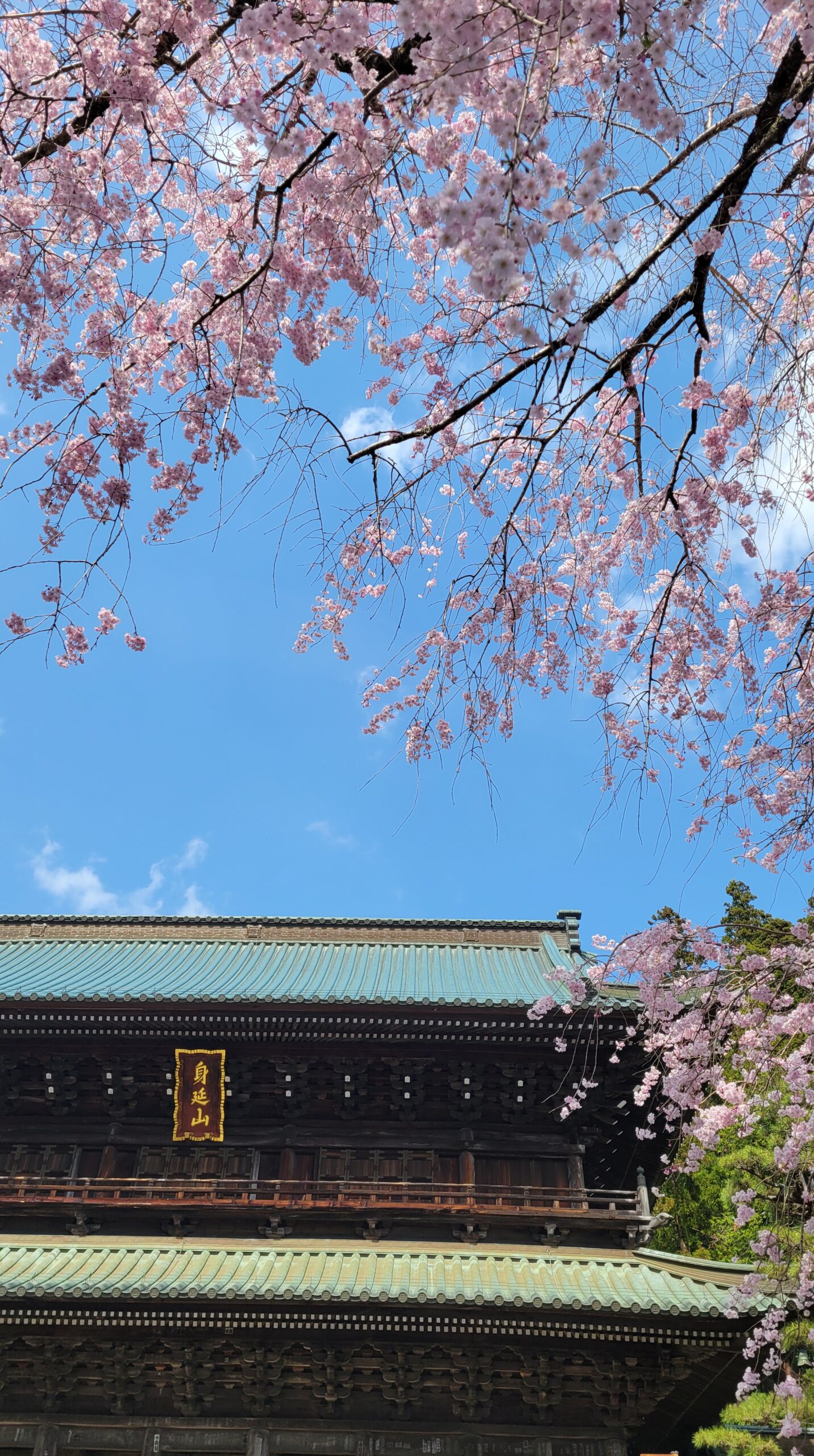 この写真は、身延山久遠寺で、階段の下にある門と美しい桜の様子を撮影したもので、奥行きと季節感を感じられる一枚です。