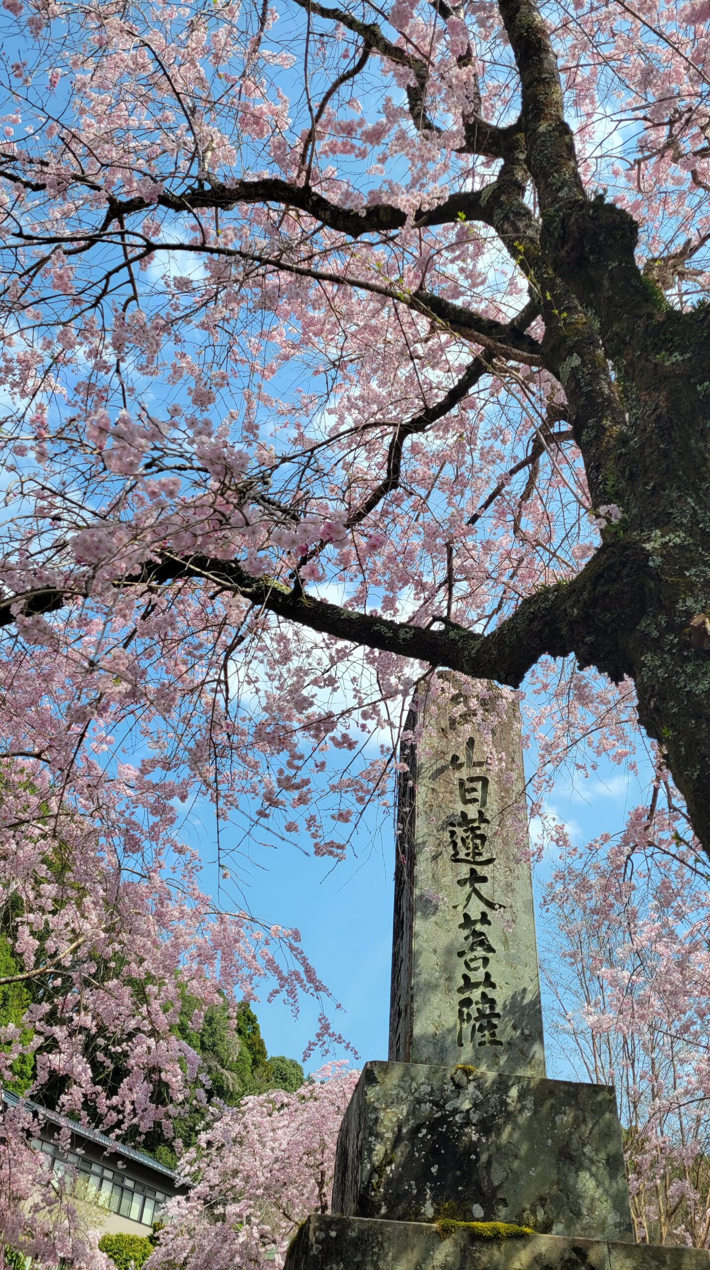 この写真は、身延山久遠寺で、石碑と満開の桜を撮影したもので、歴史と春の彩りが調和した落ち着きある風景です。