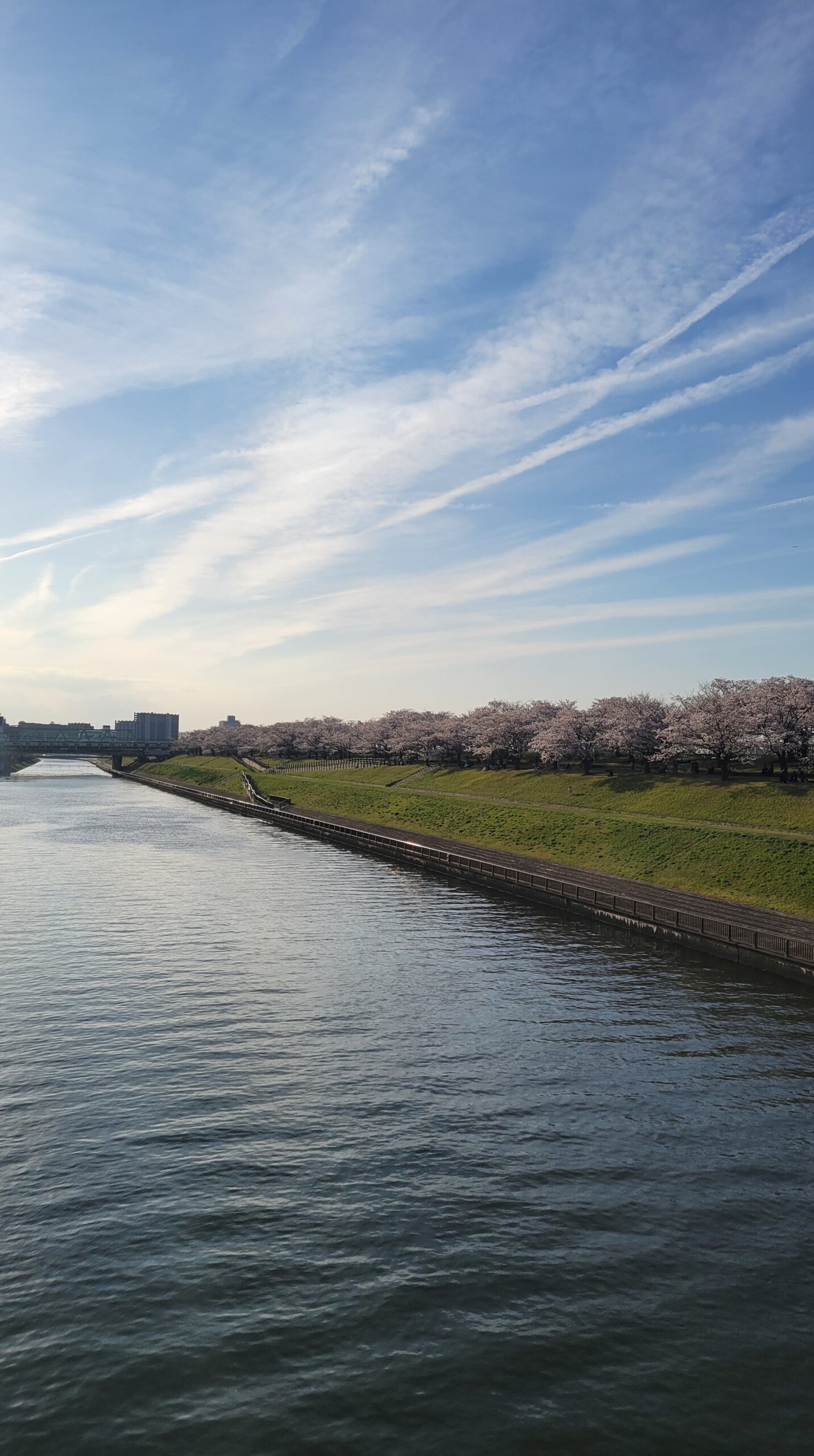 この写真は、荒川土手(赤羽)で、新河岸川と荒川の間に広がる桜並木を切り取り、両側の川に挟まれた独特のロケーションを活かして撮影したものです。