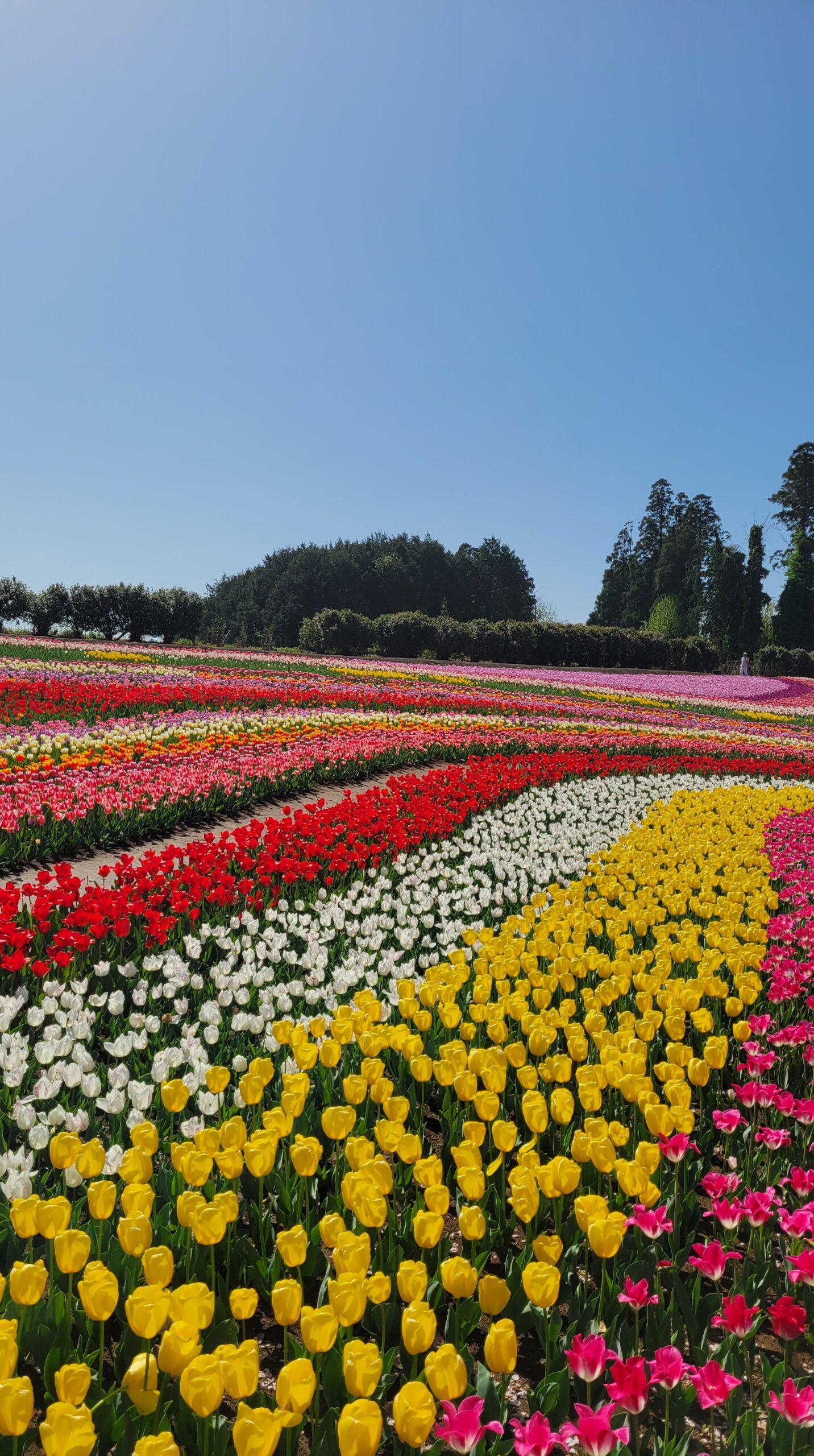 この写真は、東京ドイツ村で、満開を迎えたチューリップ畑のカラフルな曲線美を強調して撮影したものです。