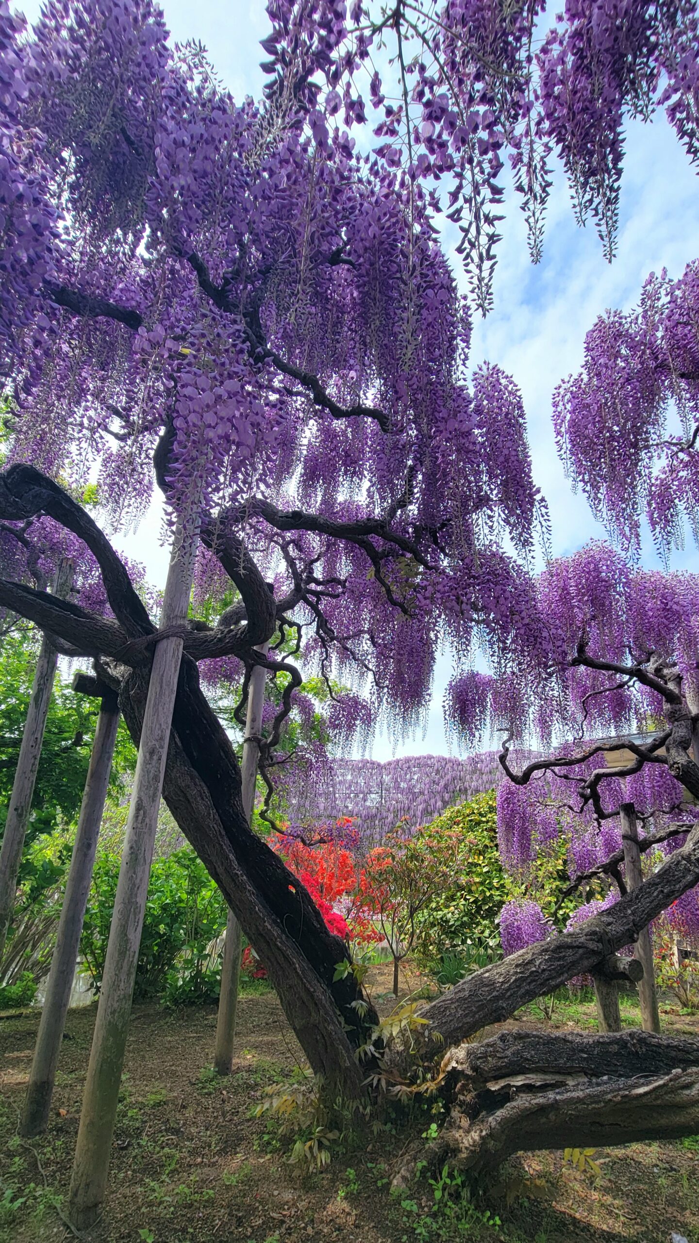 この写真は、あしかがフラワーパークで、広角モードを活かして藤の木の下から見上げ、奥に広がる大きな壁面の藤の花までを一枚に収め、スケール感を意識して撮影したのです。