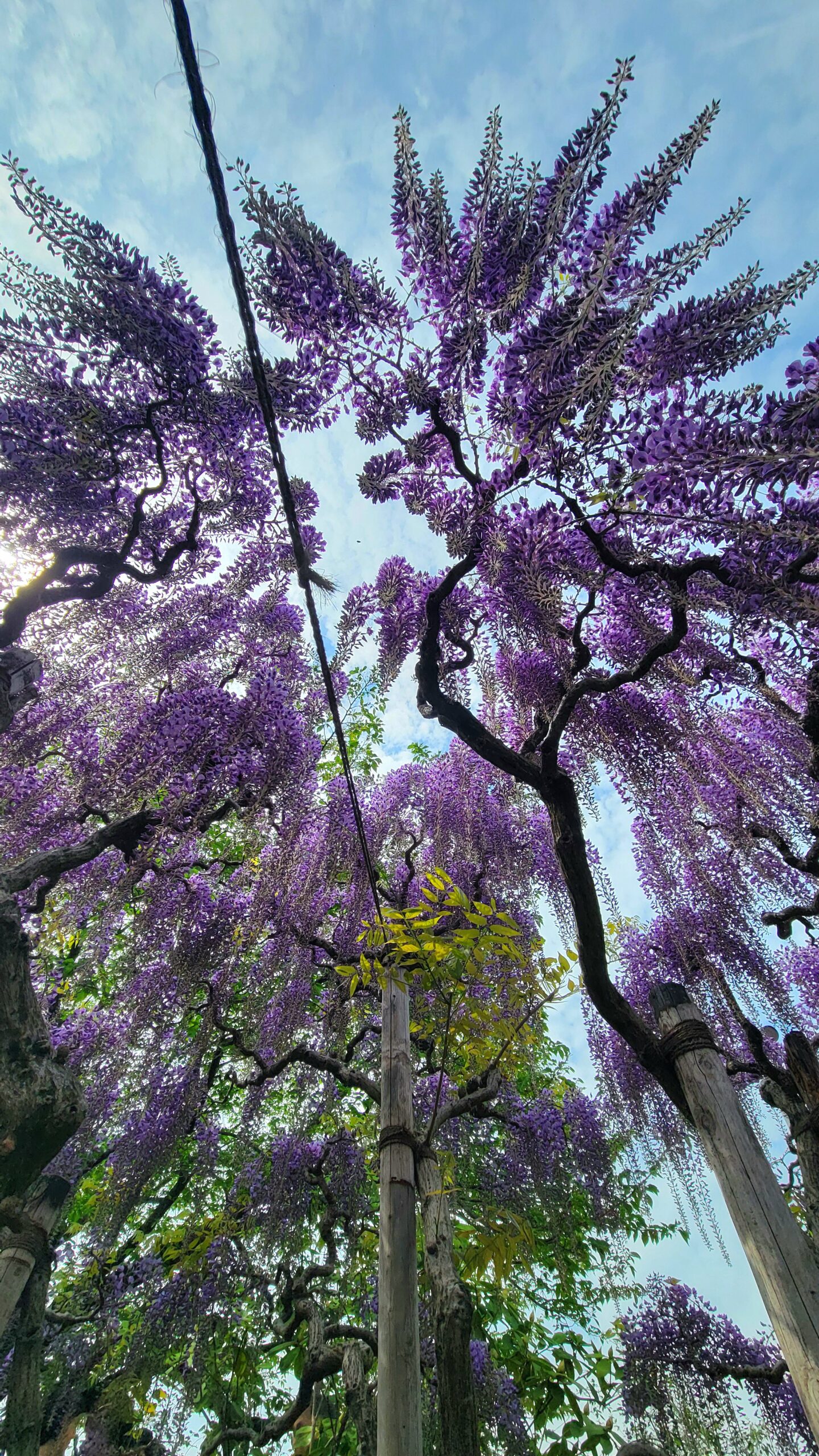 この写真は、あしかがフラワーパークで、藤の木の下から広角モードで見上げ、頭上から降り注ぐような藤の花の迫力を意識して撮影したものです。