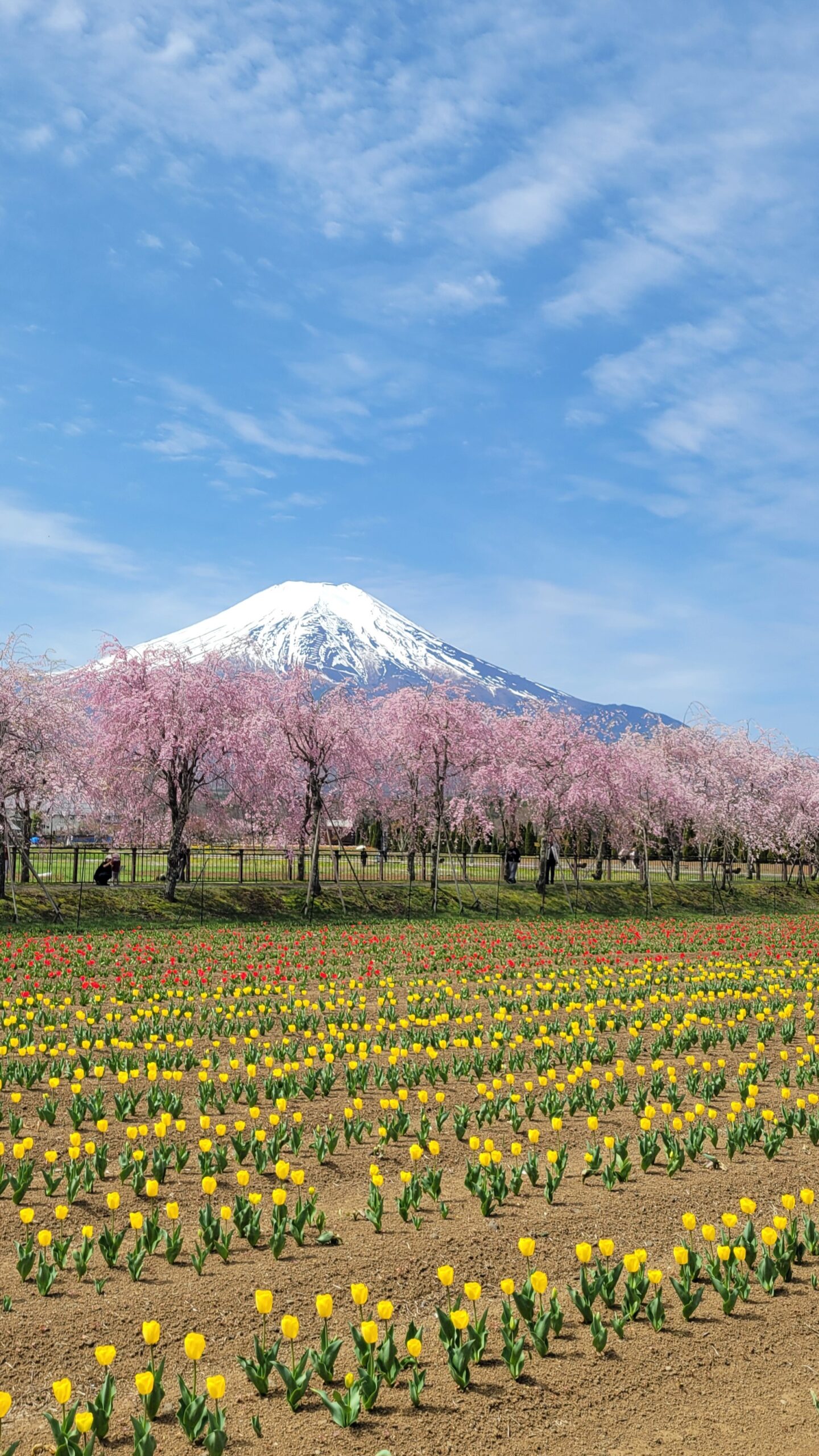 この写真は、山中湖花の都公園で、華やかな八重紅枝垂桜と手前のチューリップ畑、そして奥の富士山を一枚に収め、奥行きのある春の絶景として撮影したものです。