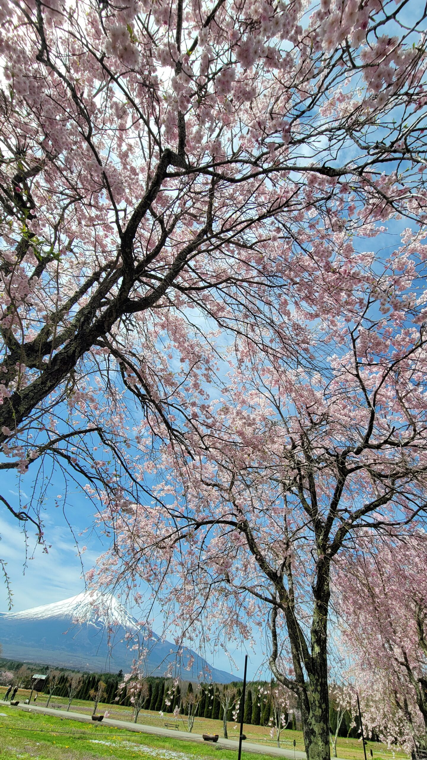 この写真は、山中湖花の都公園で、八重枝垂れ桜の下から広角モードで見上げるように撮影し、桜と富士山のダイナミックな組み合わせを表現したものです。