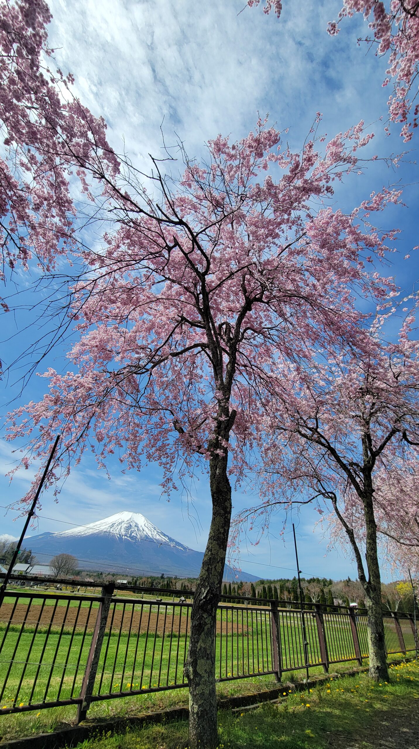 この写真は、山中湖花の都公園で、広角モードを活かして美しい八重枝垂れ桜と富士山を大きく捉え、開放感のある構図で撮影したものです。