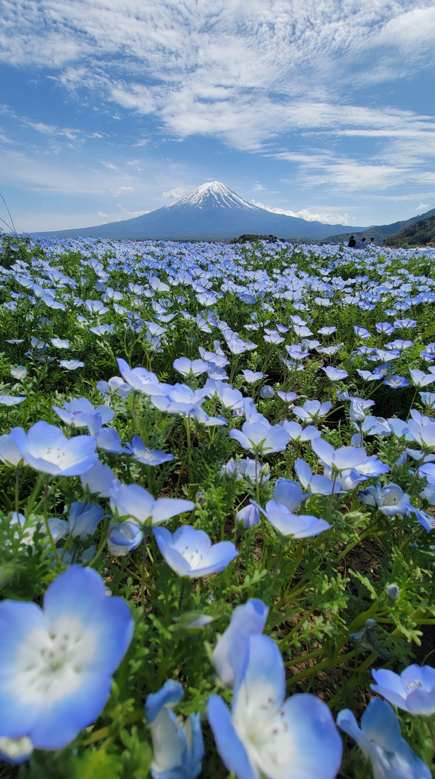 この写真は、大石公園で、広角モードを使い、富士山へと続くようなネモフィラ畑の広がりを意識して撮影したものです。