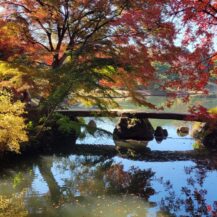 この写真は、六義園で、池にかかる石橋とモミジの紅葉を撮影したものです。