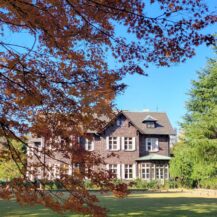 この写真は、旧岩崎邸庭園で、立派な銀杏の木の下から洋風建築を広角モードで撮影したものです。