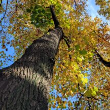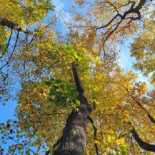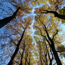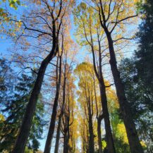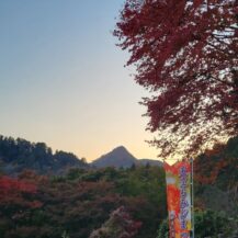 この写真は、薬王院(高尾山)の門付近にある像を、下から見上げるようなアングルで撮影したもので、背景には鮮やかな紅葉が広がり、秋の高尾山らしい荘厳で美しい雰囲気を表現しています。