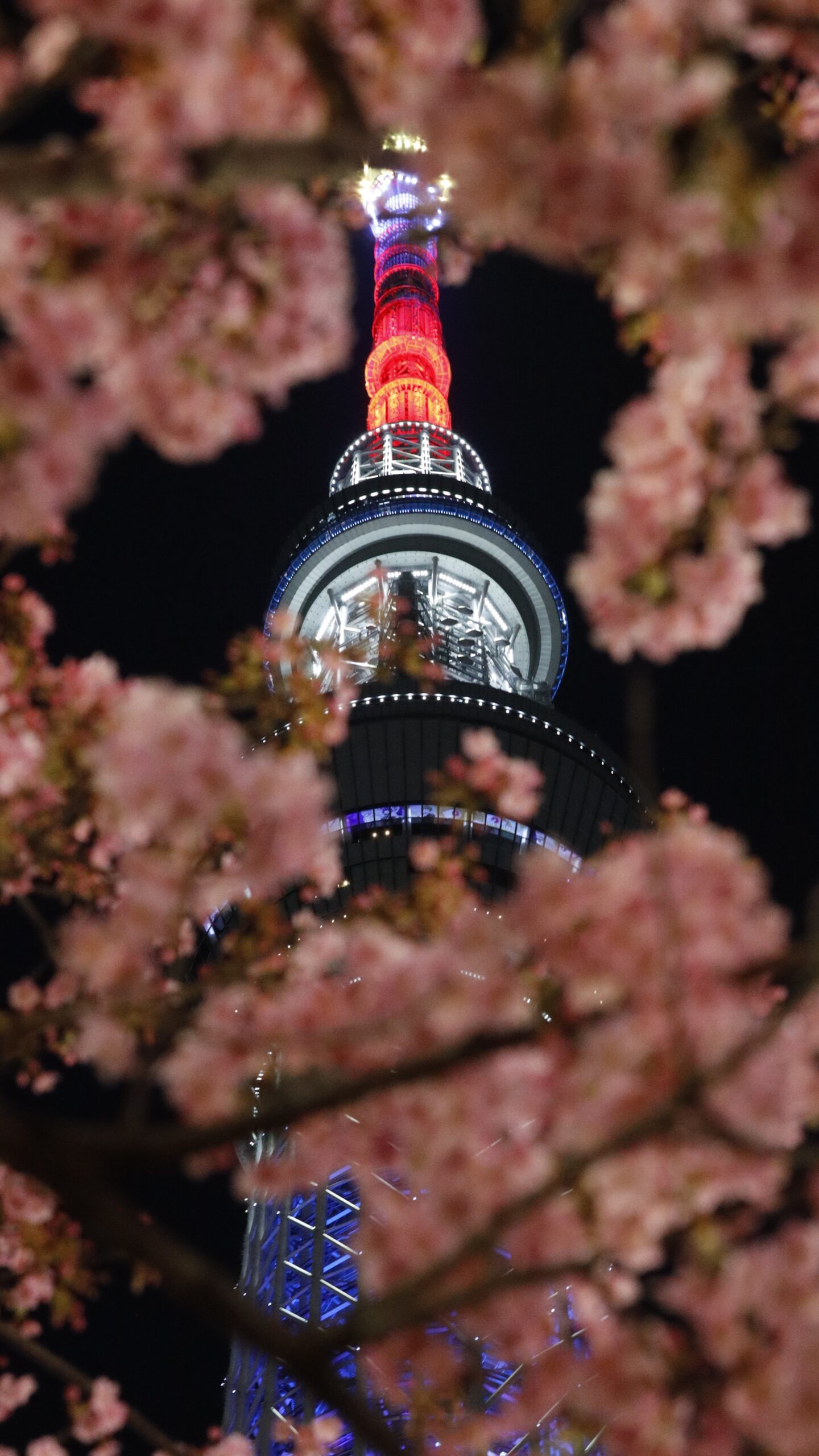この写真は、スカイツリーの下に咲く河津桜を見上げるようにして撮影しました。