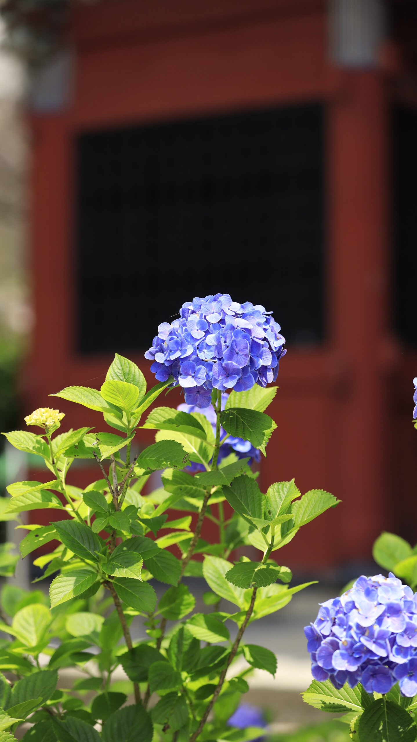 2025年 雨引観音(雨引山楽法寺)|紫陽花にピントを合わせて この写真は、雨引観音で、建物の廊下を斜め下から見上げるように構図をとり、中央に咲く紫陽花にピントを合わせて撮影したものです。 2025年2025年6月6月紫陽花花茨城県雨引観音(雨引山楽法寺)