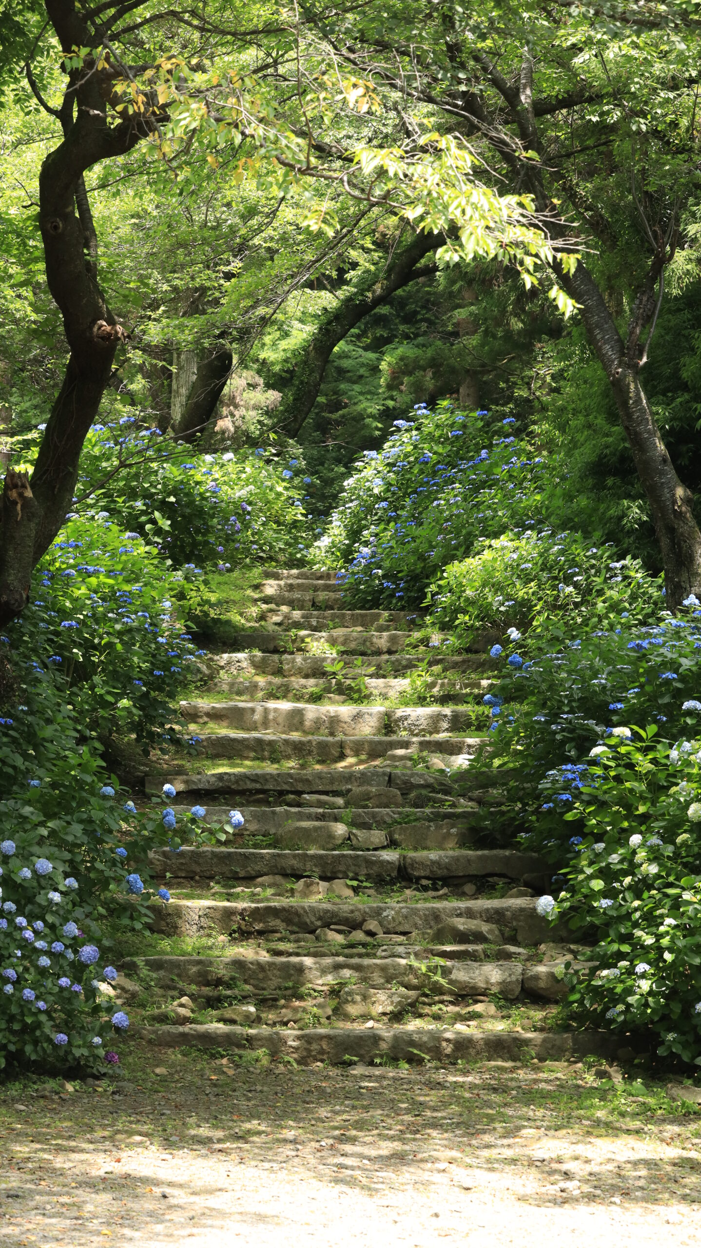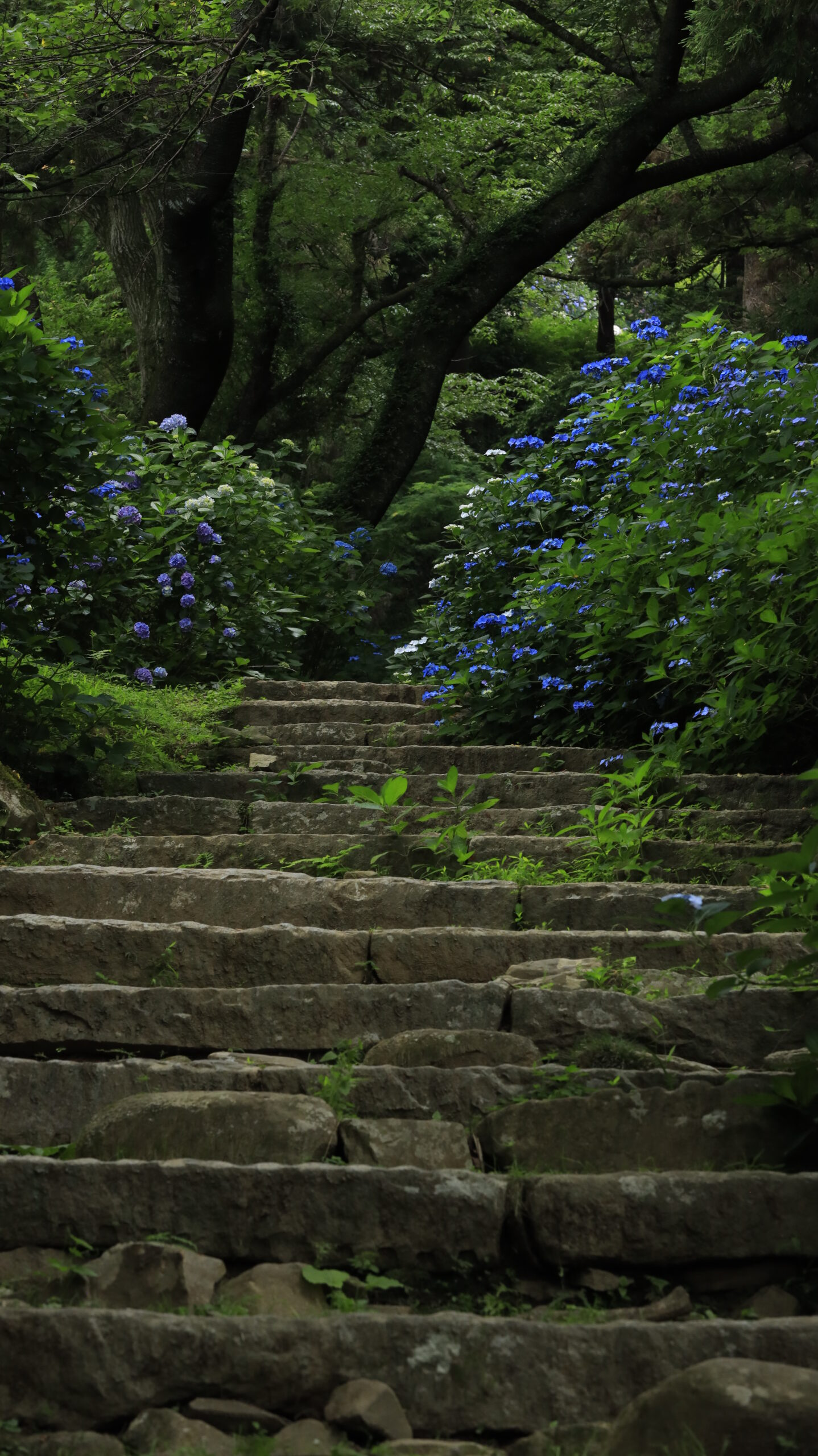 2025年 雨引観音(雨引山楽法寺)|朝日差し込む階段 この写真は、雨引観音で、神社の門の外にある紫陽花階段に朝の光が差し込み、幻想的な雰囲気が漂っていた様子を撮影しました。 2025年2025年6月6月紫陽花花茨城県雨引観音(雨引山楽法寺)