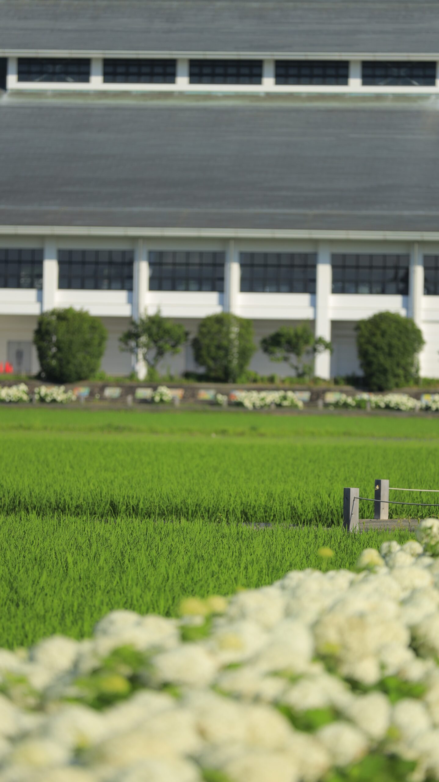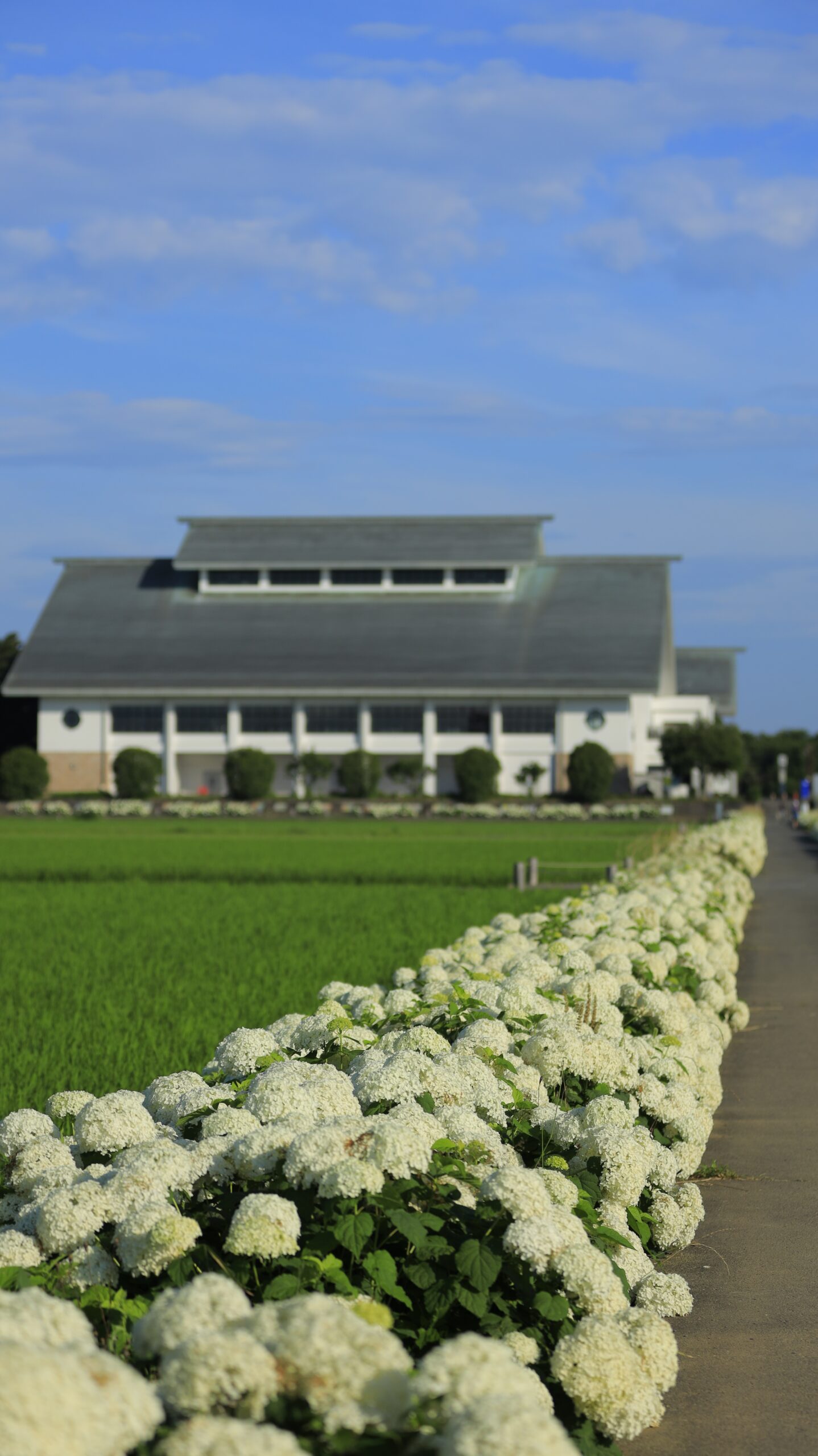 2025年 騎西総合体育館ふじアリーナ|田んぼにピントの奥行き構図 この写真は、騎西総合体育館ふじアリーナのアナベルロードで、真ん中の田んぼにピントを合わせて、上下の紫陽花や建物をぼかした構図で撮影しました。 2025年2025年6月6月埼玉県紫陽花花騎西総合体育館ふじアリーナ