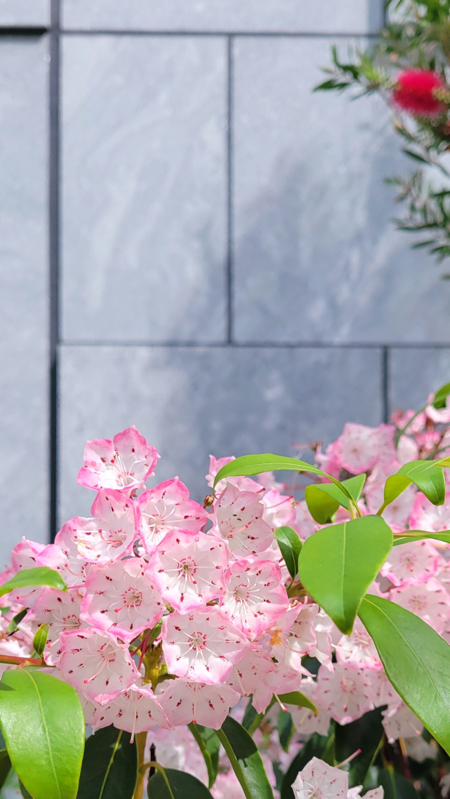 カルミアは、蕾のときは金平糖のように丸く、咲くと星形に広がる、まるでお菓子のように愛らしい花です。ピンクや白の花が房のように咲き並ぶ姿は華やかで、初夏の庭をやさしく彩ります。その精巧な模様はまるで手描きのようで、思わず近くでじっと眺めたくなるほど。見た目の美しさだけでなく、可憐さと不思議さをあわせ持つ、心が和む花です。