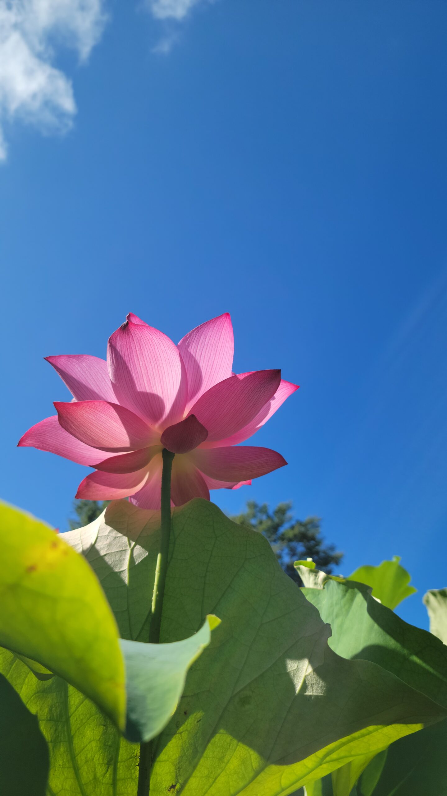 2025年 大船フラワーセンター|ピンクの蓮が放つ存在感 この写真は、大船フラワーセンターで、鮮やかなピンク色の蓮の花を斜め下から見上げるようにして撮影したもので、花の存在感が際立つ構図です。 2025年2025年7月7月大船フラワーセンター神奈川県花蓮