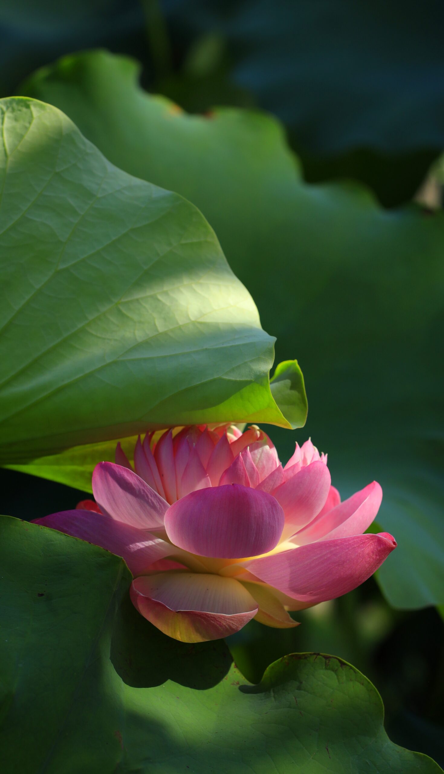 2025年 大船フラワーセンター|葉に隠れて咲く蓮の静けさ この写真は、大船フラワーセンターで、葉に隠れるようにひっそりと咲いていた蓮の花を見つけ、控えめながらも美しい花の存在感を表現して撮影したものです。 2025年2025年7月7月大船フラワーセンター神奈川県花蓮
