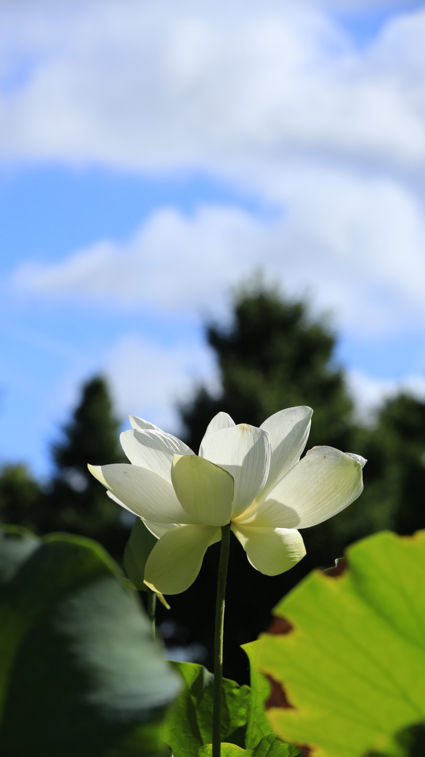 2025年 大船フラワーセンター|白蓮と青空が描く清浄の世界 この写真は、大船フラワーセンターで、綺麗な白い蓮の花を側面からとらえ、背景には青空を重ねることで、清らかな印象を強調した構図に仕上げました。 2025年2025年7月7月大船フラワーセンター神奈川県花蓮