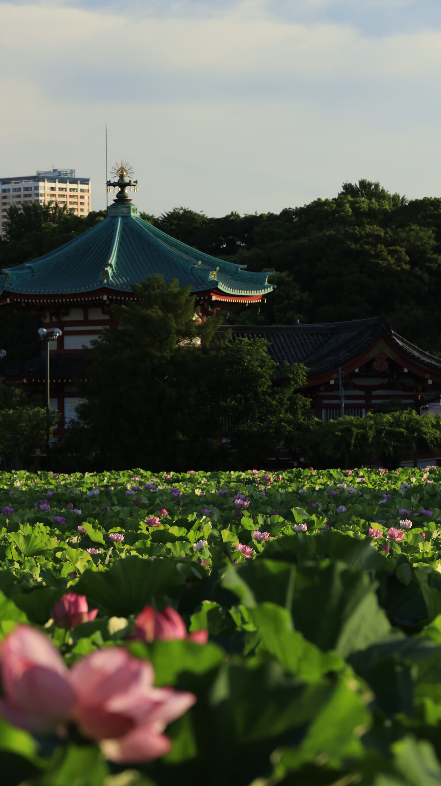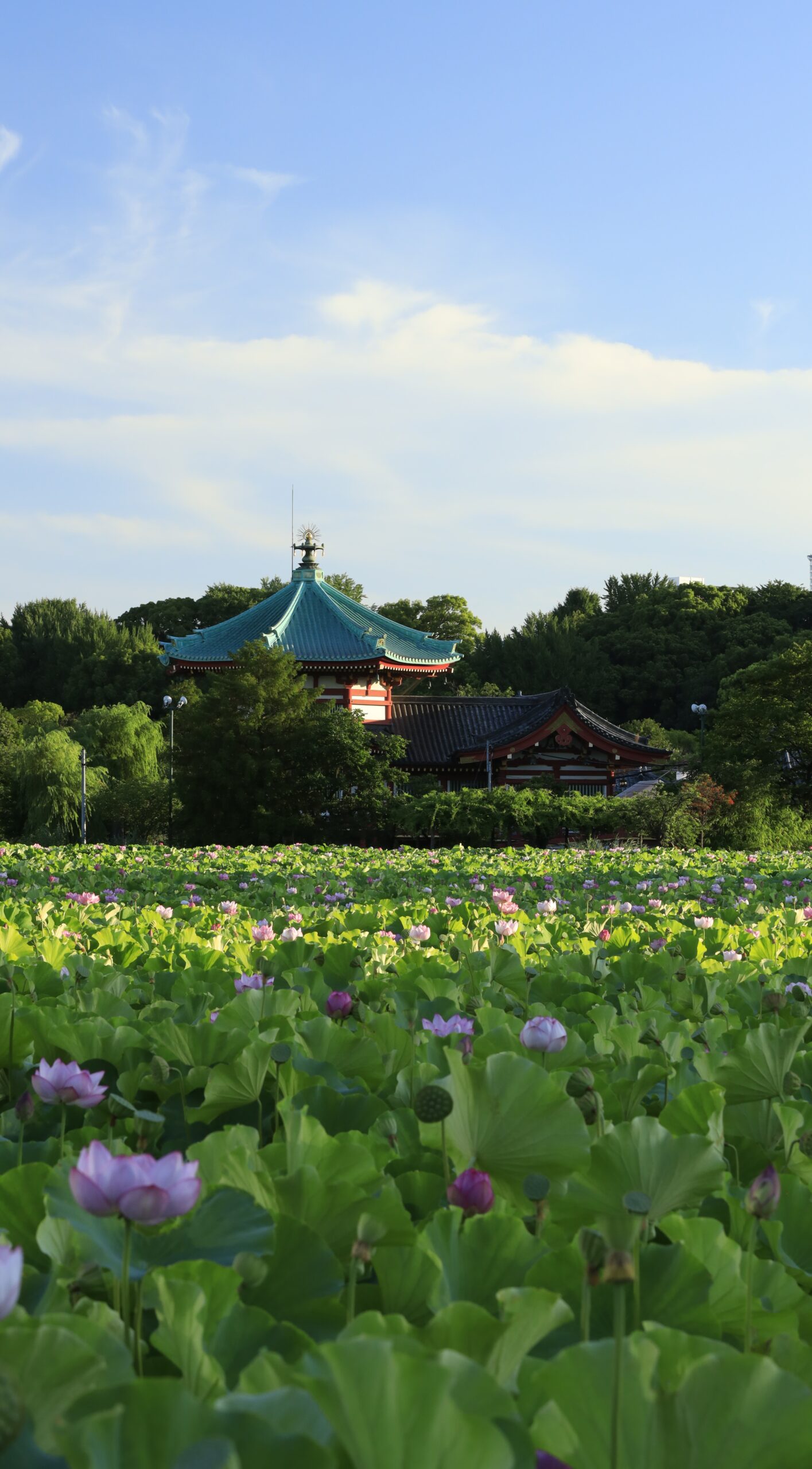 2025年 不忍池|三重奏の夏 この写真は、不忍池で、ディスプレイされた風鈴と咲く蓮の花、そして奥に見える弁天堂を一つの画角に収めて撮影したものです。 2025年2025年7月7月不忍池東京都色々な風景花蓮風鈴