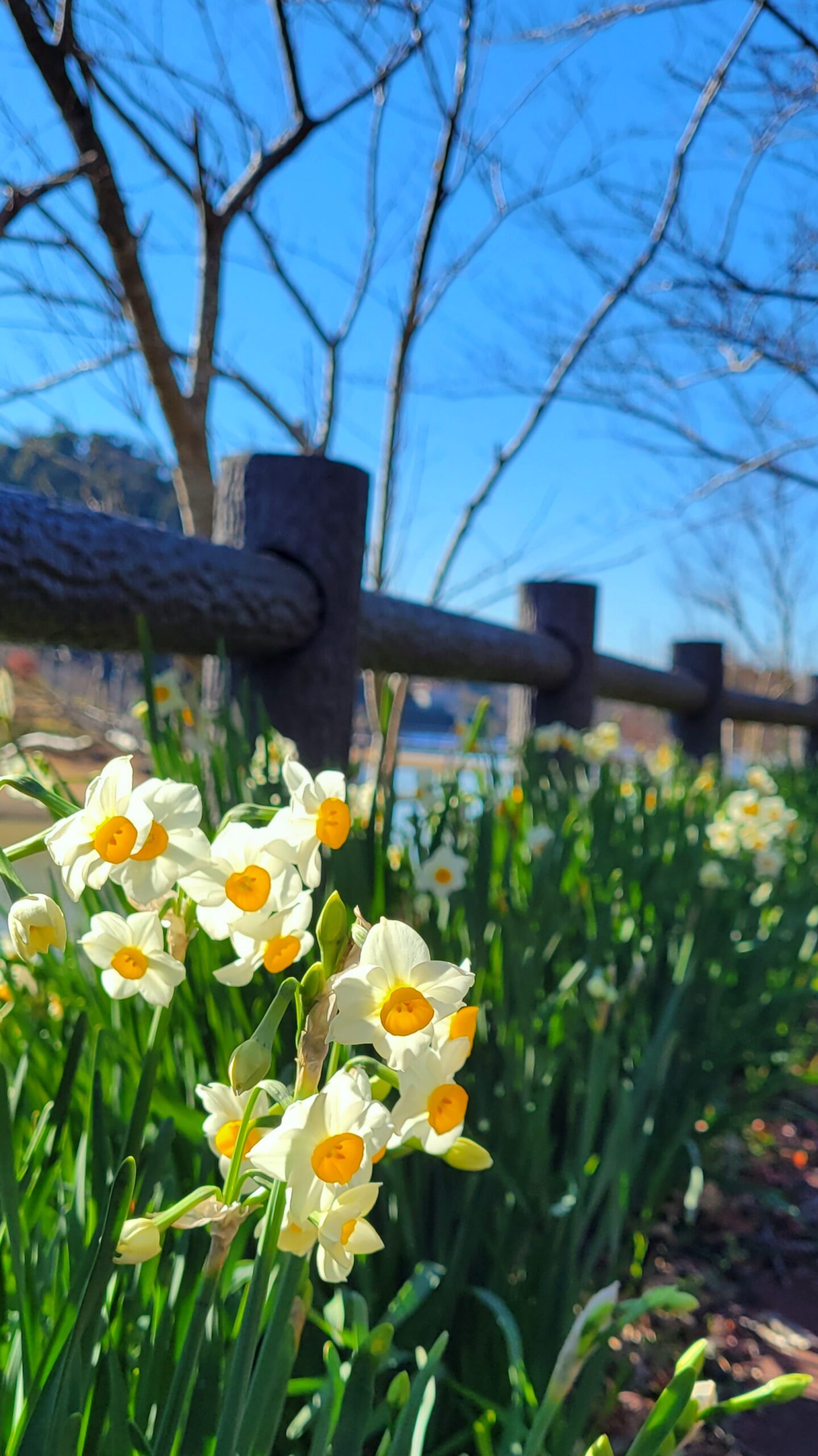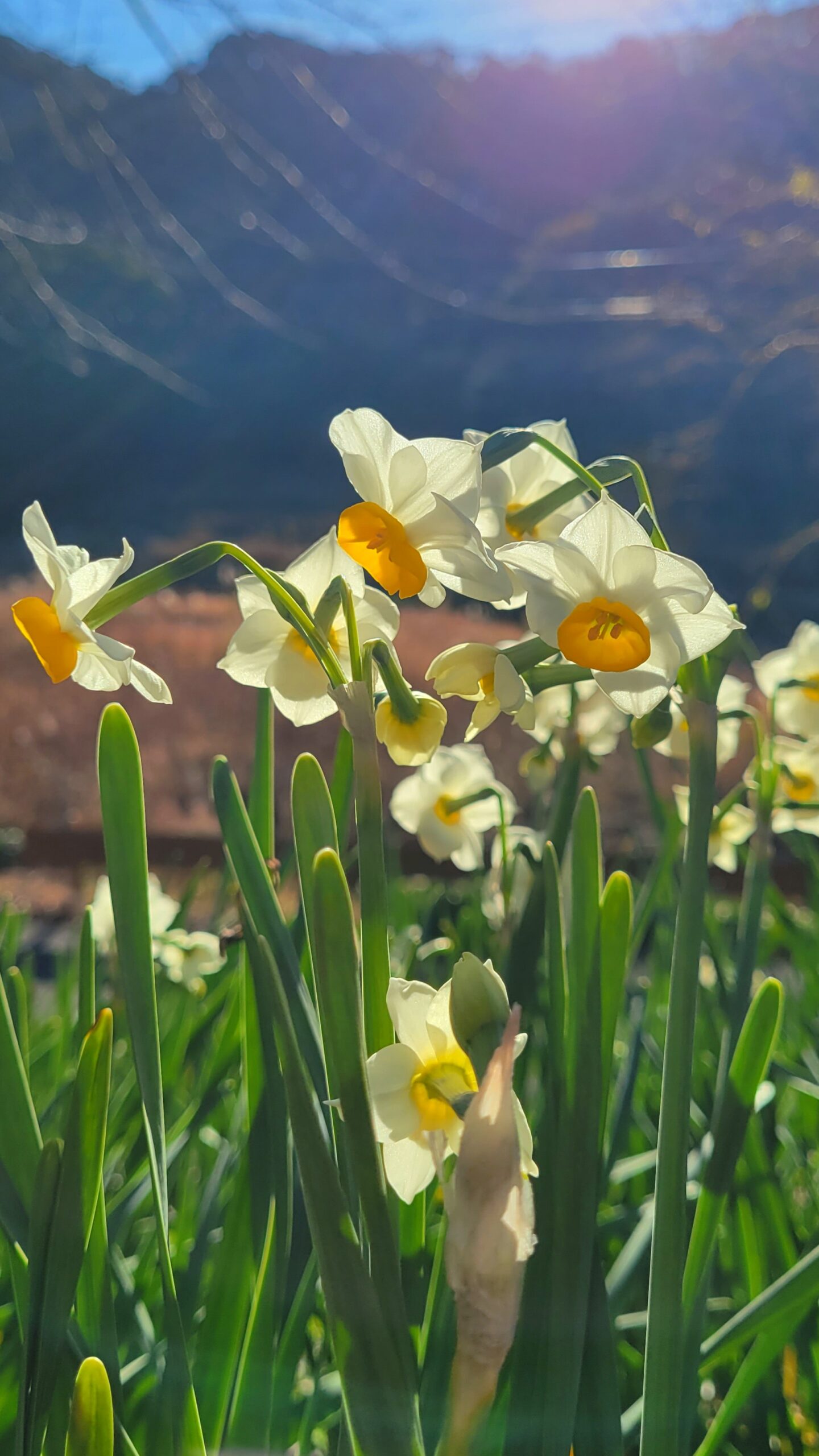 1月 佐久間ダム|手前をぼかして奥行きを出した水仙 この写真は、手前の水仙をぼかすことで後ろの風景との奥行きを表現し、立体感を意識した構図で撮影しました。 1月2025年2025年1月佐久間ダム千葉県水仙花