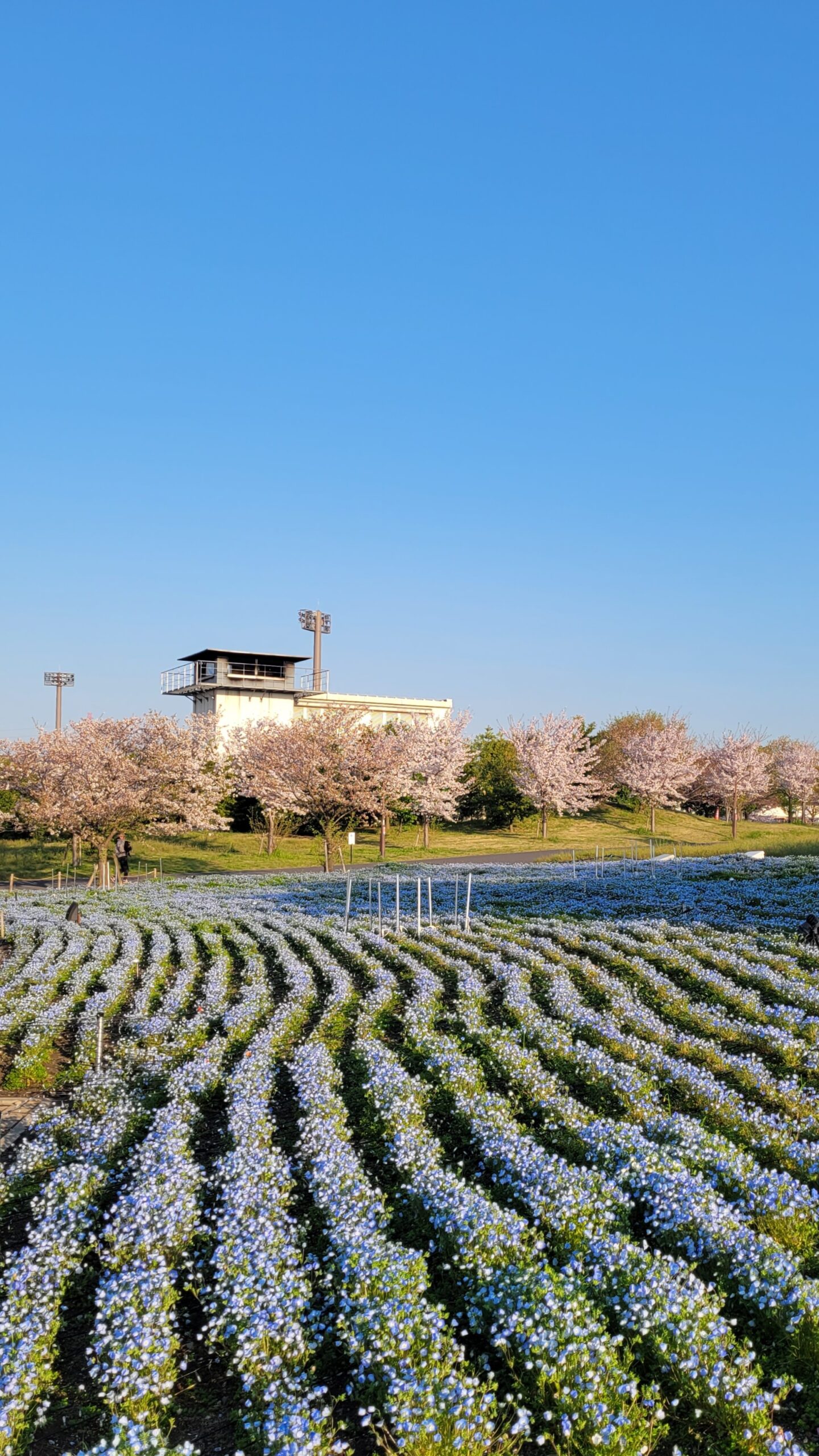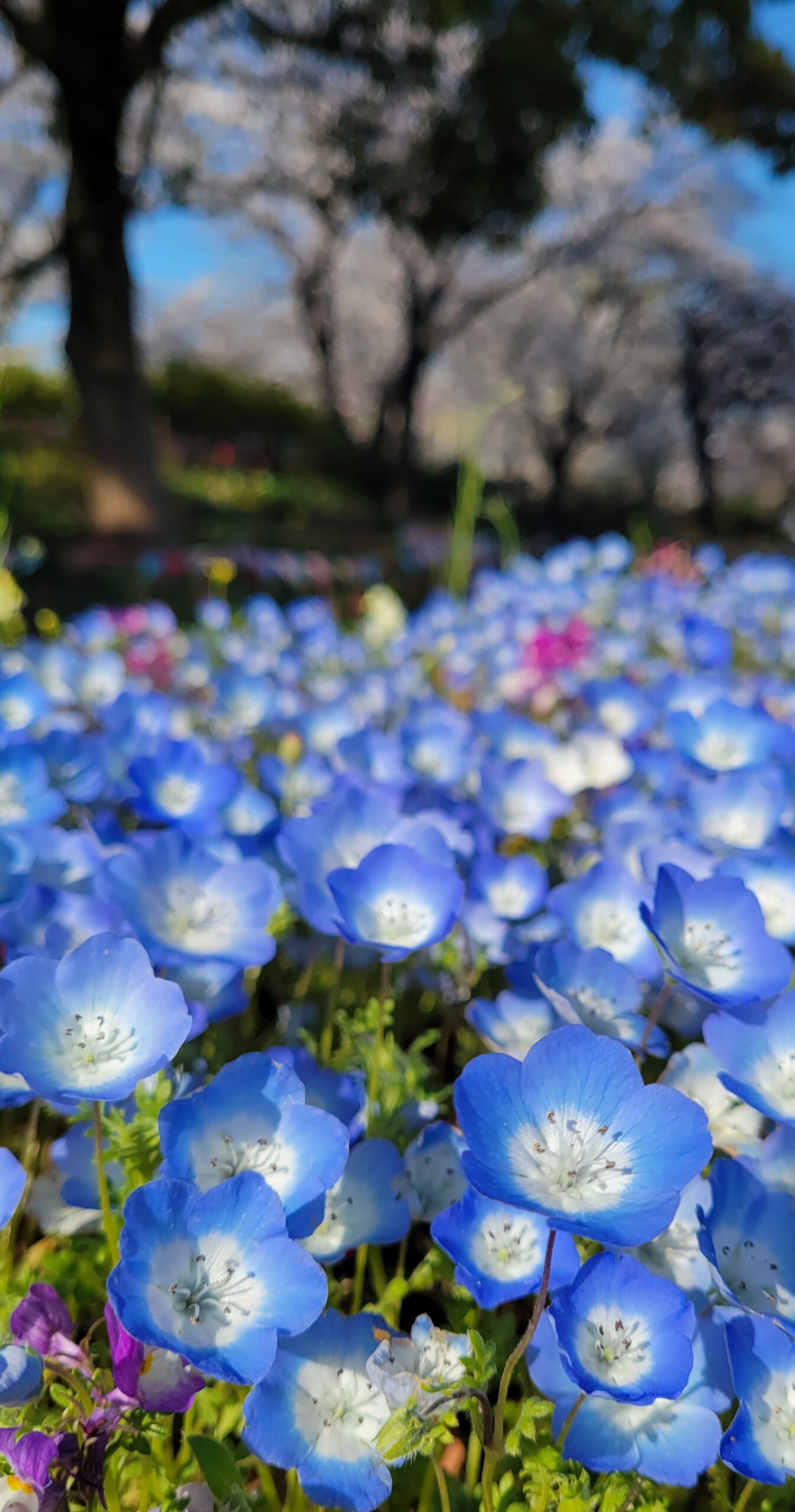 2025年 舎人公園|ネモフィラと桜の春コラボ この写真は、咲き始めたネモフィラと、そのそばで春を感じさせるように咲く桜の様子を一緒に写してみました。 2025年2025年4月4月ネモフィラ東京都舎人公園花