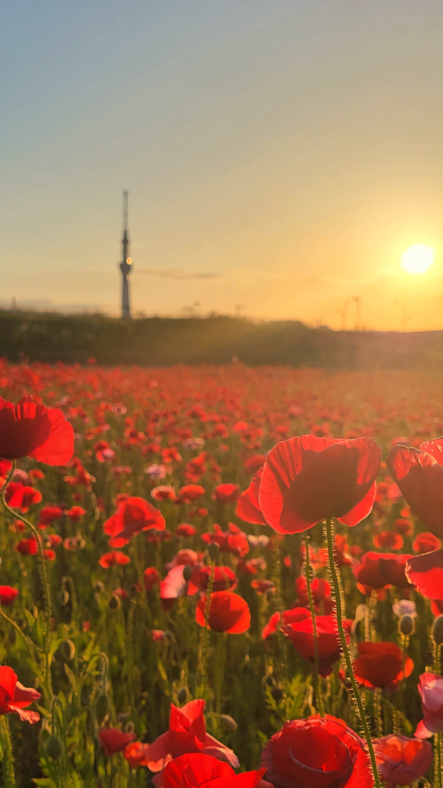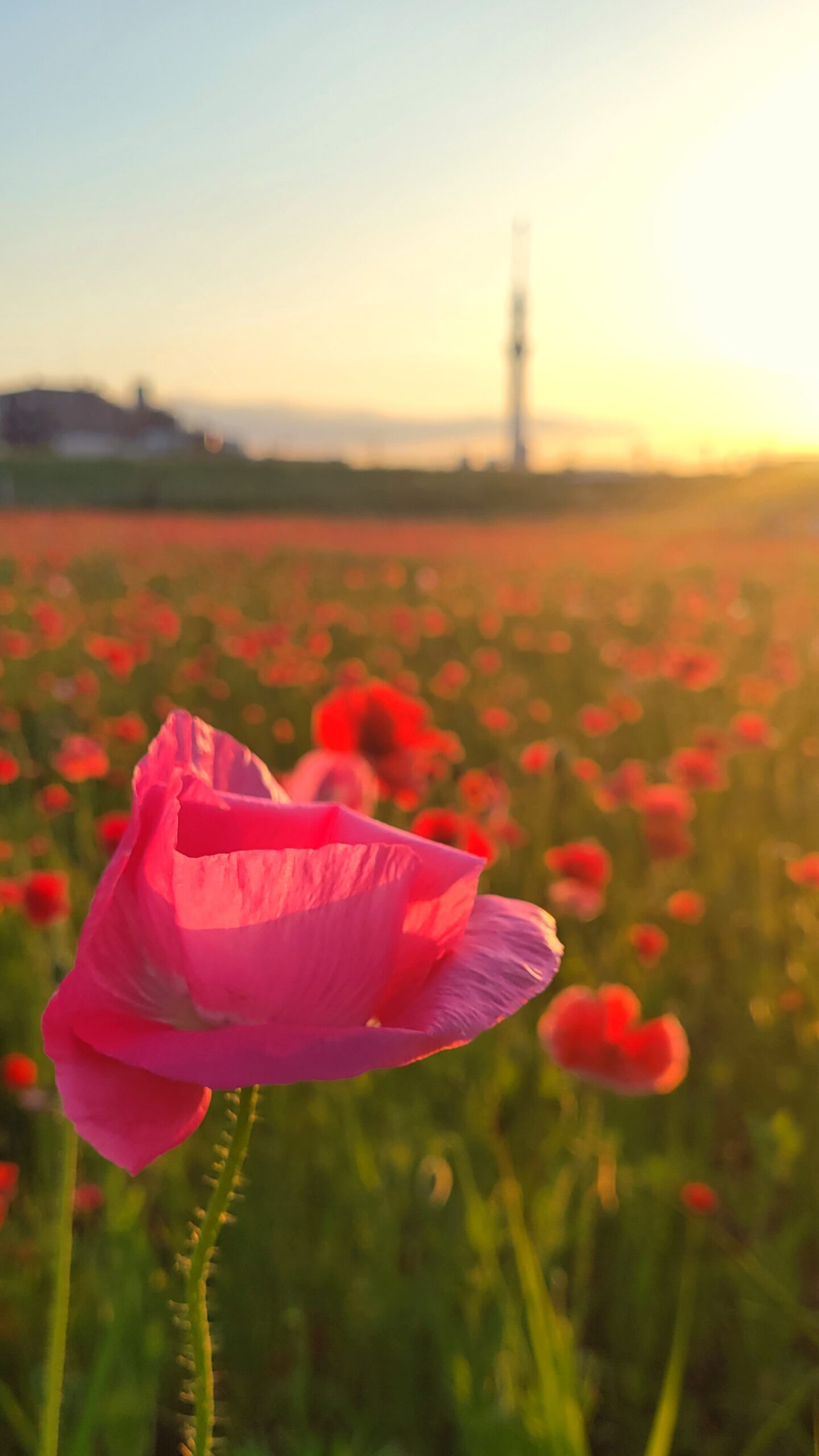 2025年 あけぼの山農業公園|一輪の輝きと染まる空 この写真は、あけぼの山農業公園で、朝焼けに染まる空を背景に、一厘の美しいシャーレーポピーにピントを合わせて撮影したものです。 2025年2025年5月5月あけぼの山農業公園ポピー千葉県花