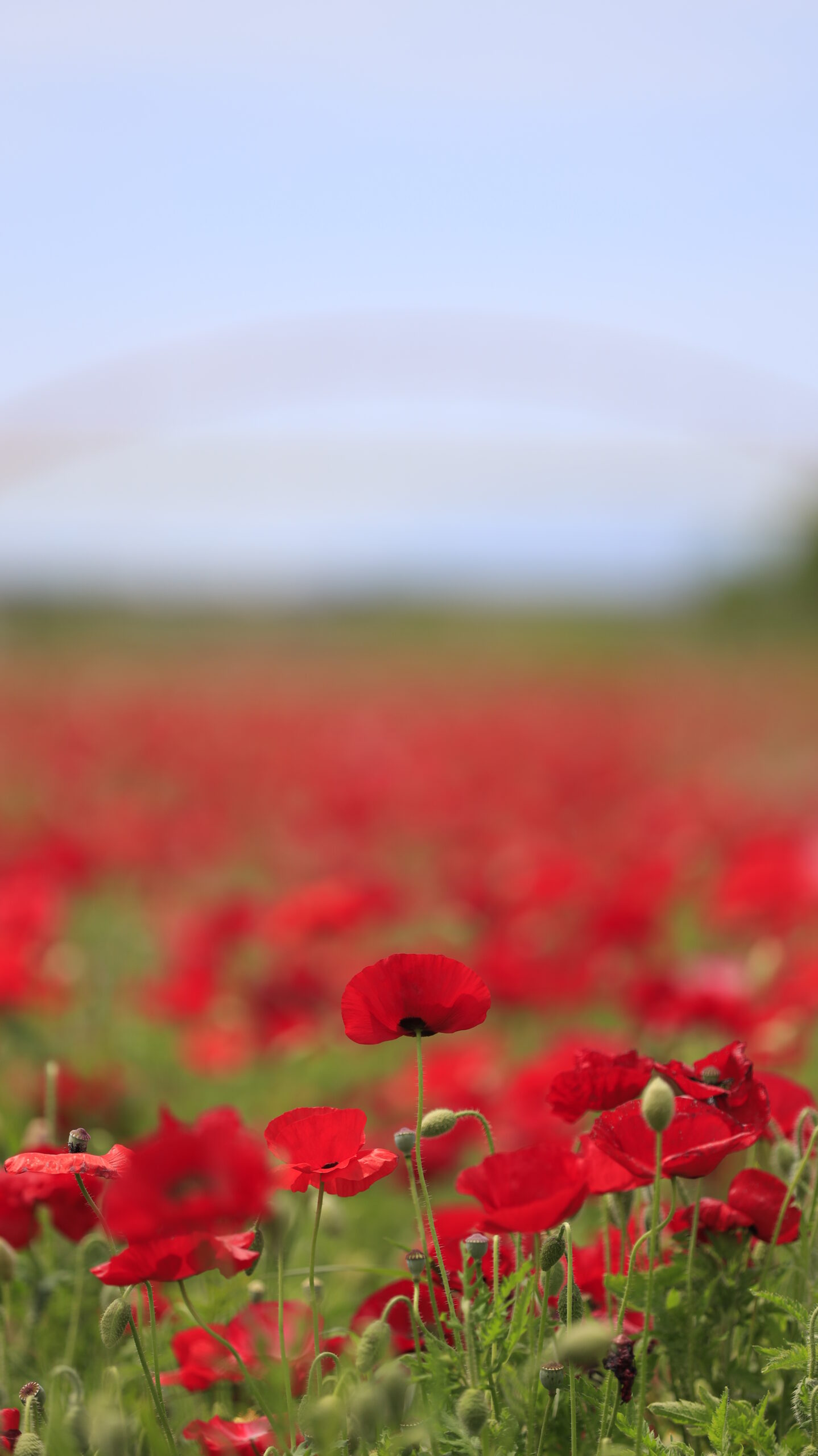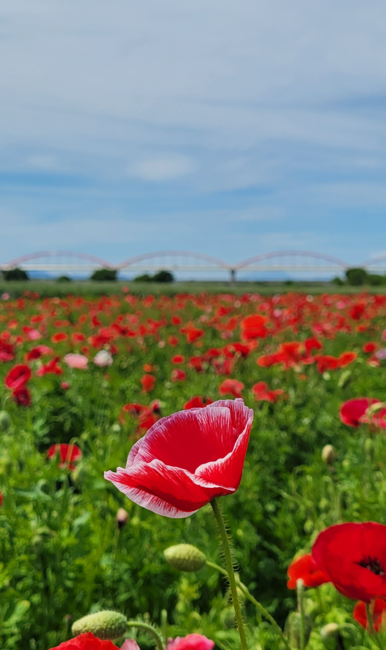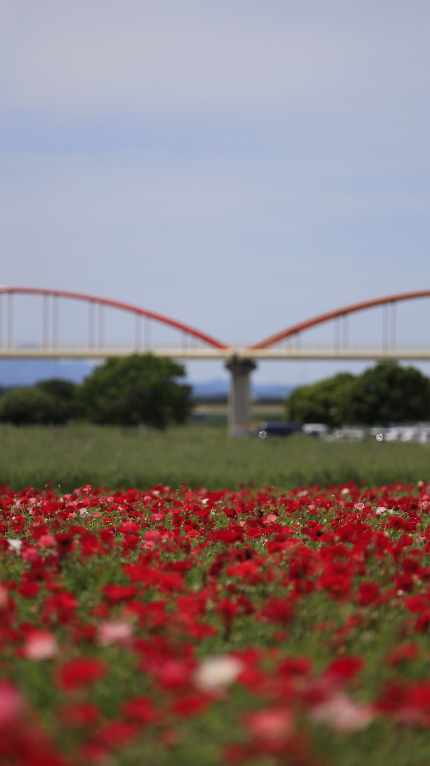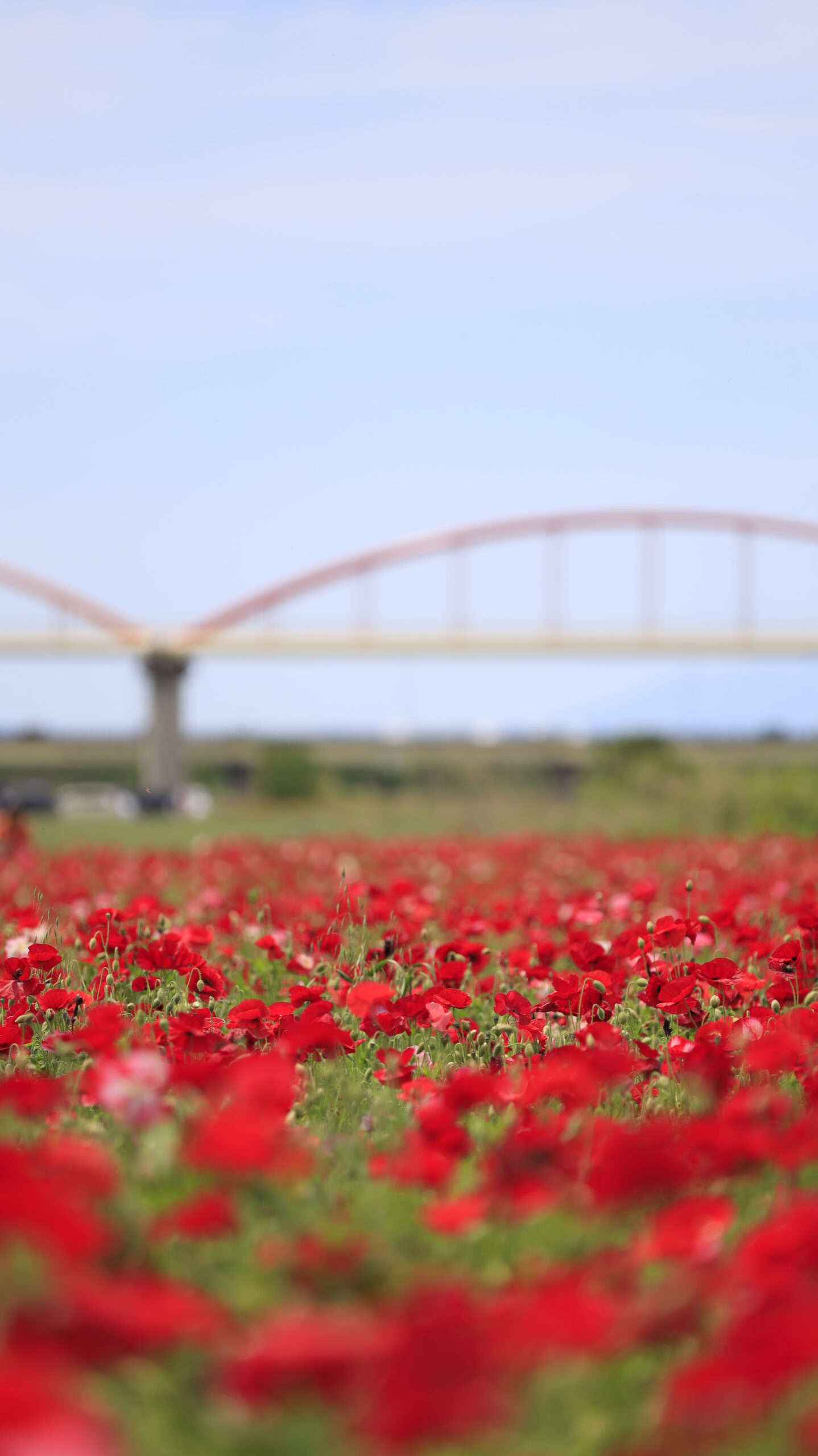 2025年 コスモスアリーナふきあげ|広がるポピー畑と遠くの橋 この写真は、コスモスアリーナふきあげにて、広がるポピー畑と遠くに架かる橋が美しく調和する風景を意識して撮影したものです。 2025年2025年5月5月コスモスアリーナふきあげポピー埼玉県花