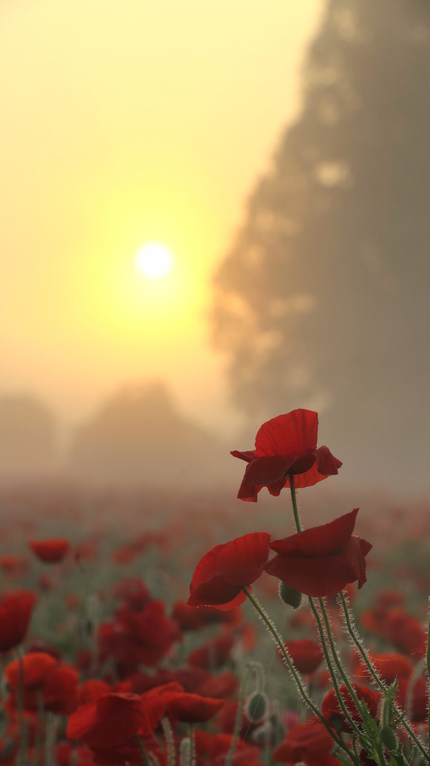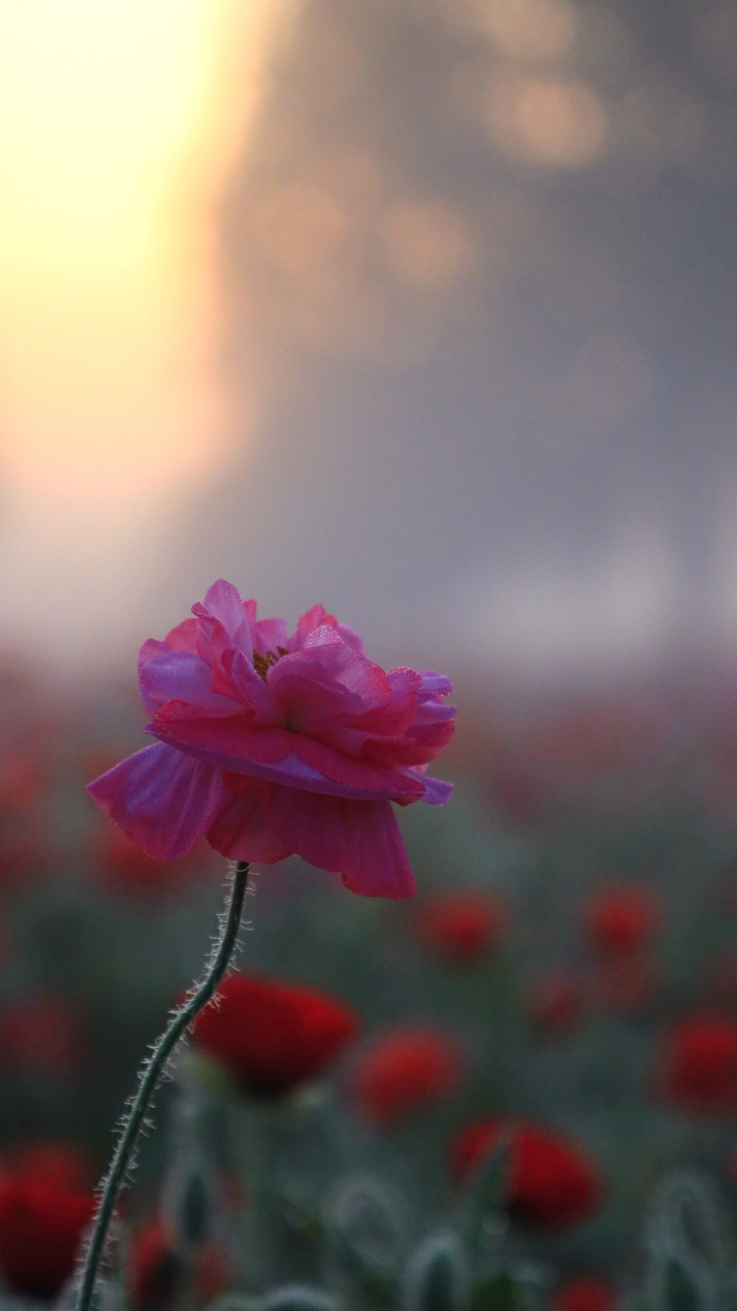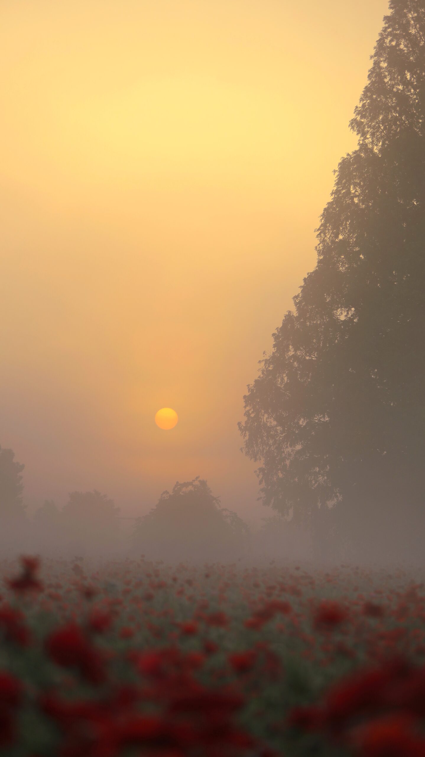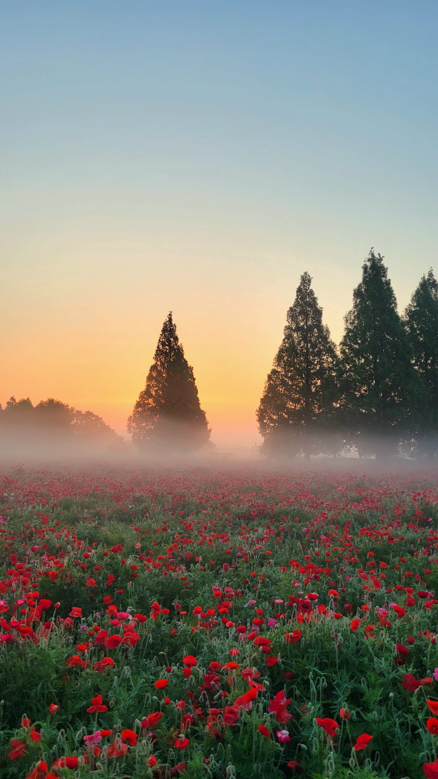 2025年 あけぼの山農業公園|静寂に包まれた朝焼けとポピー この写真は、霧が立ち込めた静かな朝に、あけぼの山農業公園でシャーレーポピーと朝焼けのコラボレーションを捉えた一枚です。 2025年2025年5月5月あけぼの山農業公園ポピー千葉県花