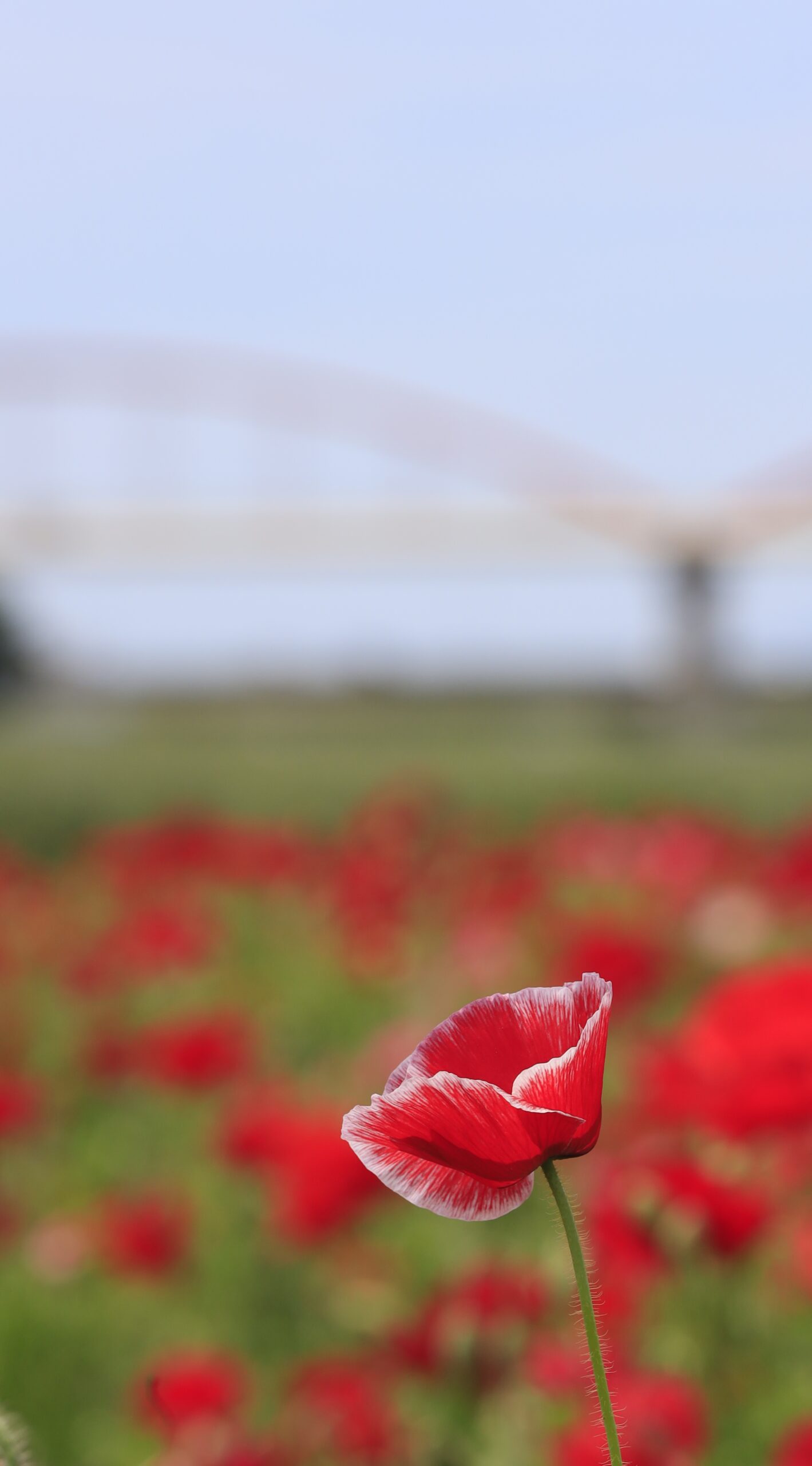 2025年 コスモスアリーナふきあげ|ポピーと橋のやさしい調和 この写真は、コスモスアリーナふきあげで、可愛いポピーと背景に見える遠くの橋を組み合わせて、バランス良く収めた一枚です。 2025年2025年5月5月コスモスアリーナふきあげポピー埼玉県花