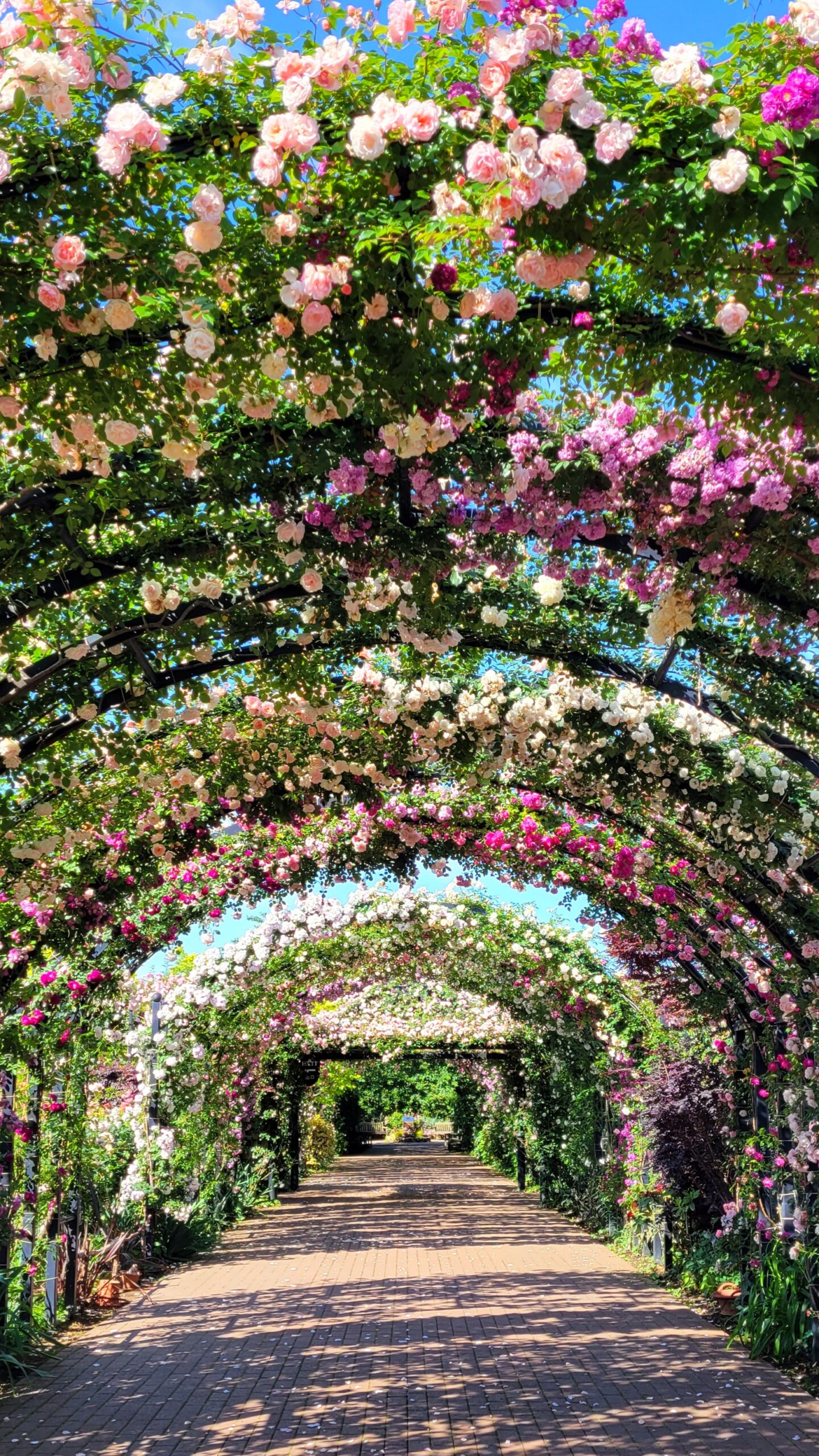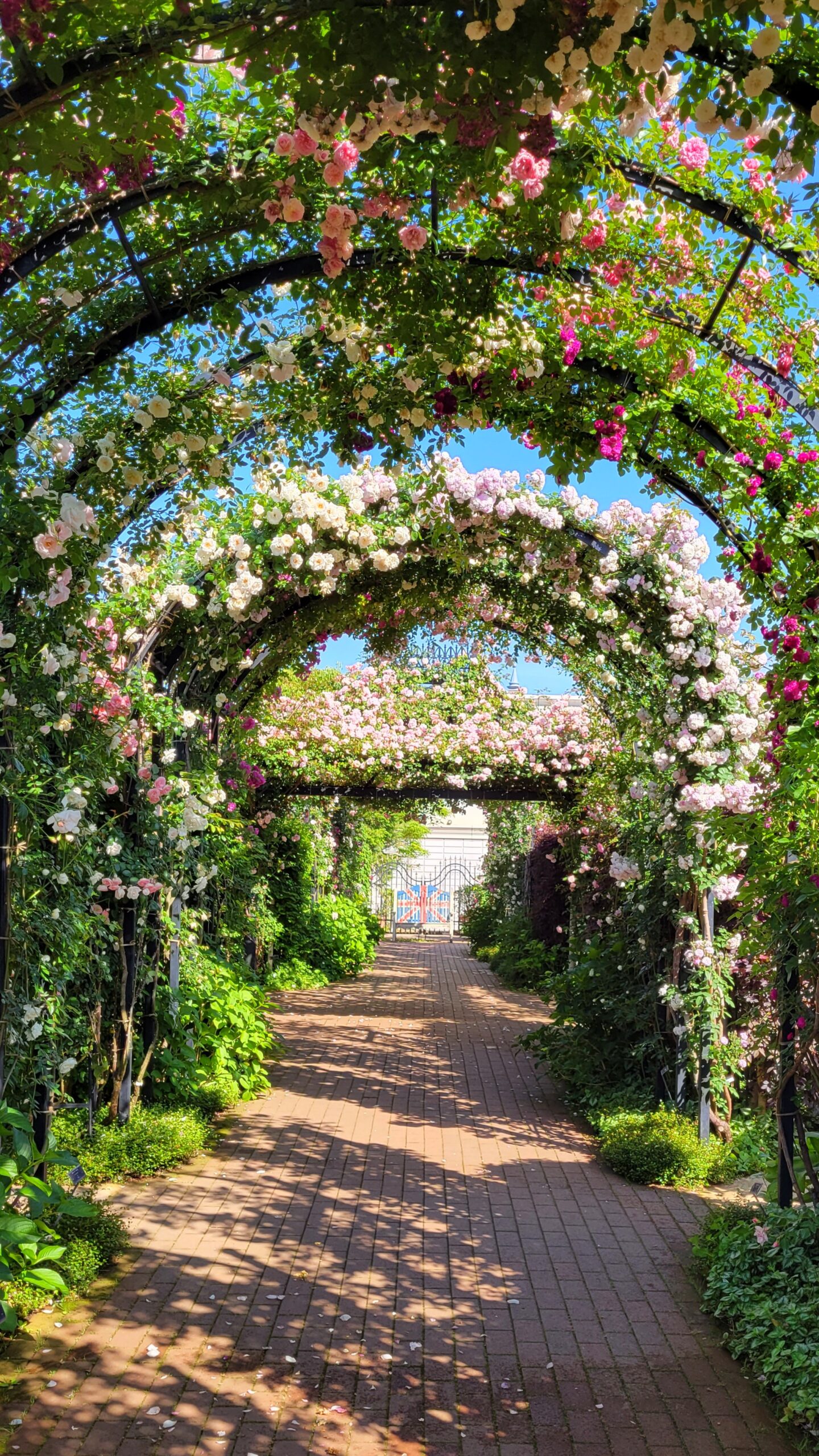 2025年 横浜イングリッシュガーデン|正面アーチで迎えるバラの道 この写真は、横浜イングリッシュガーデンの入ってすぐの正面にある薔薇のアーチを、奥行きを感じられる構図で撮影したものです。 2025年2025年5月5月横浜イングリッシュガーデン神奈川県花薔薇