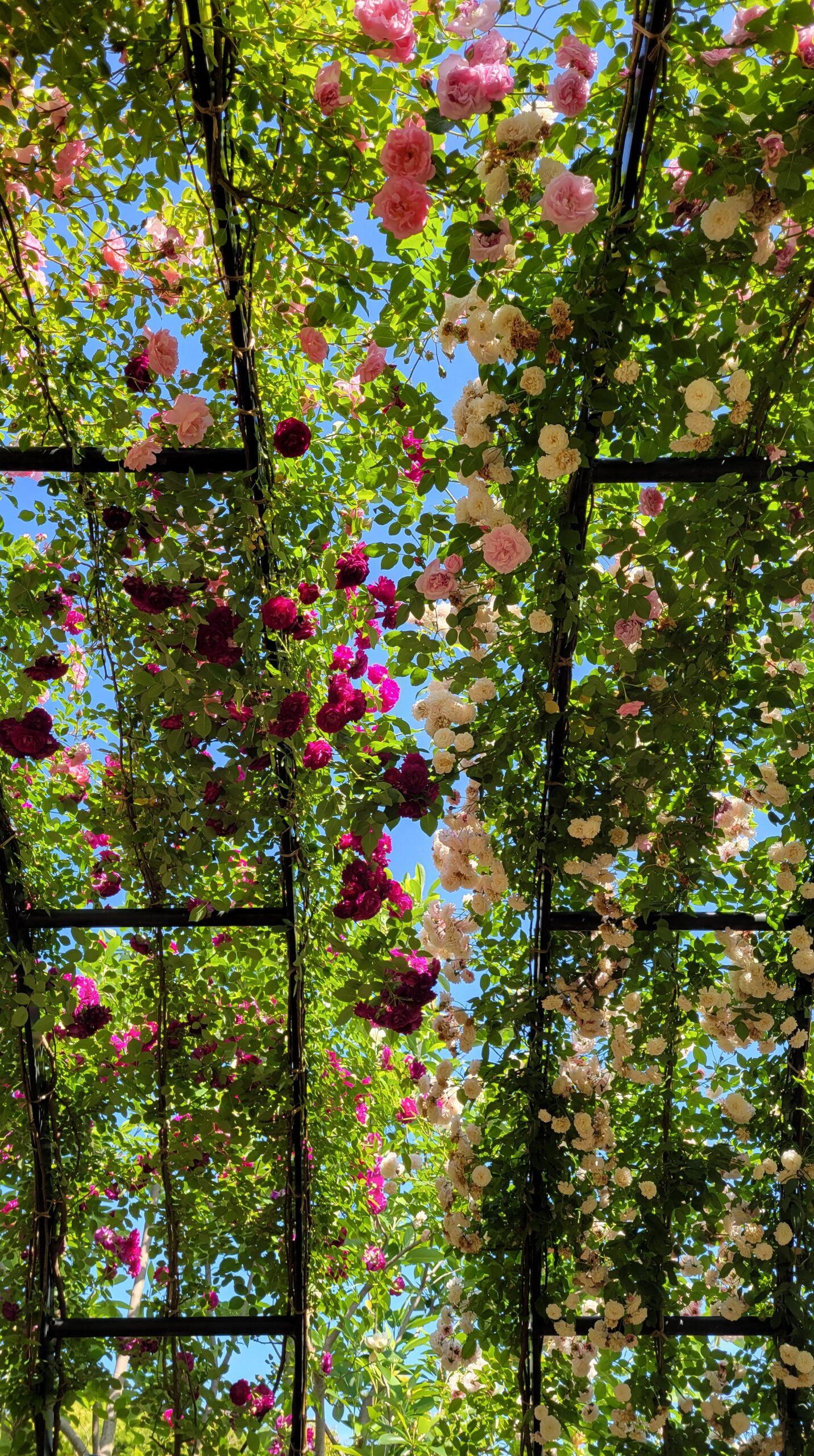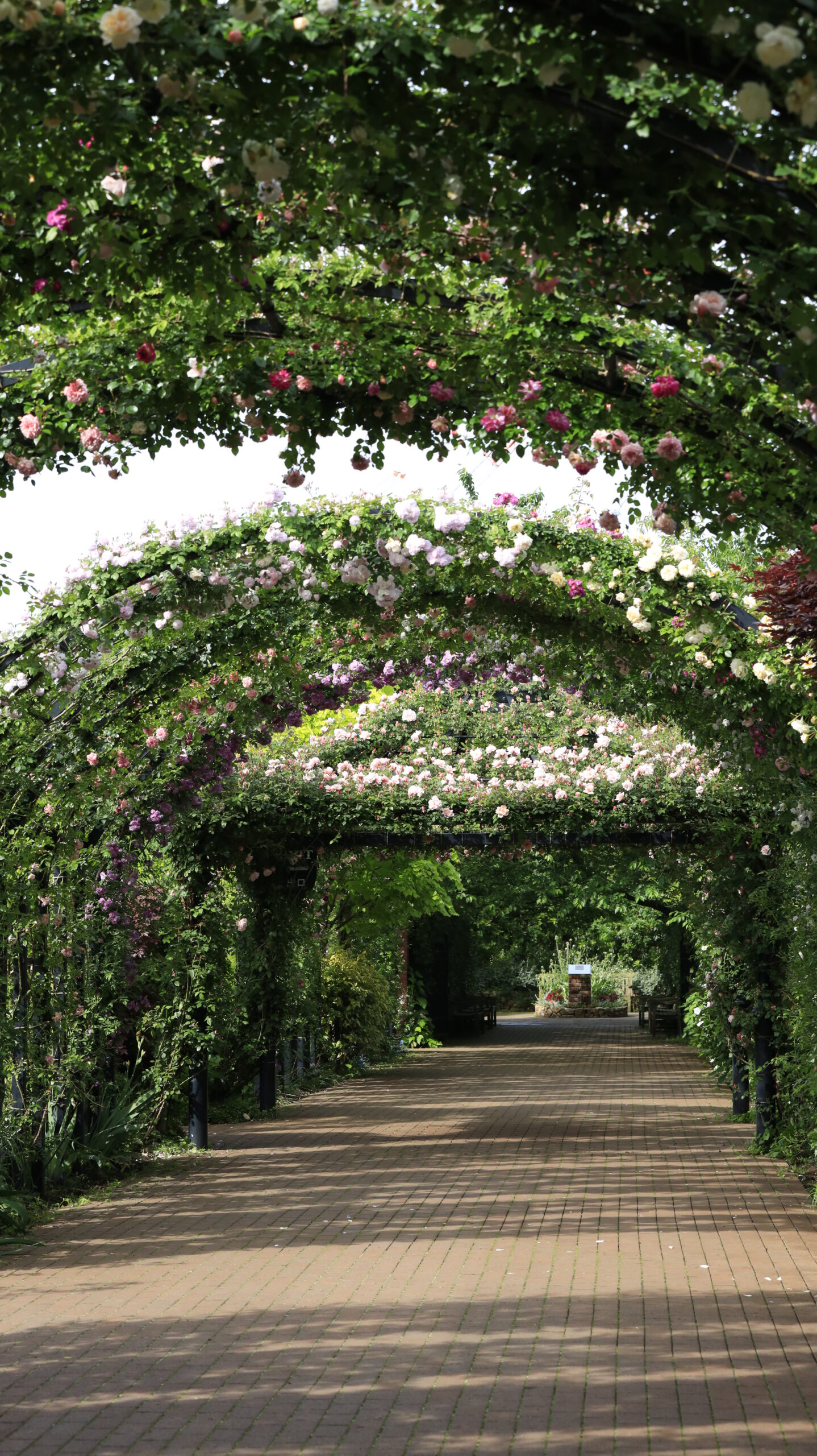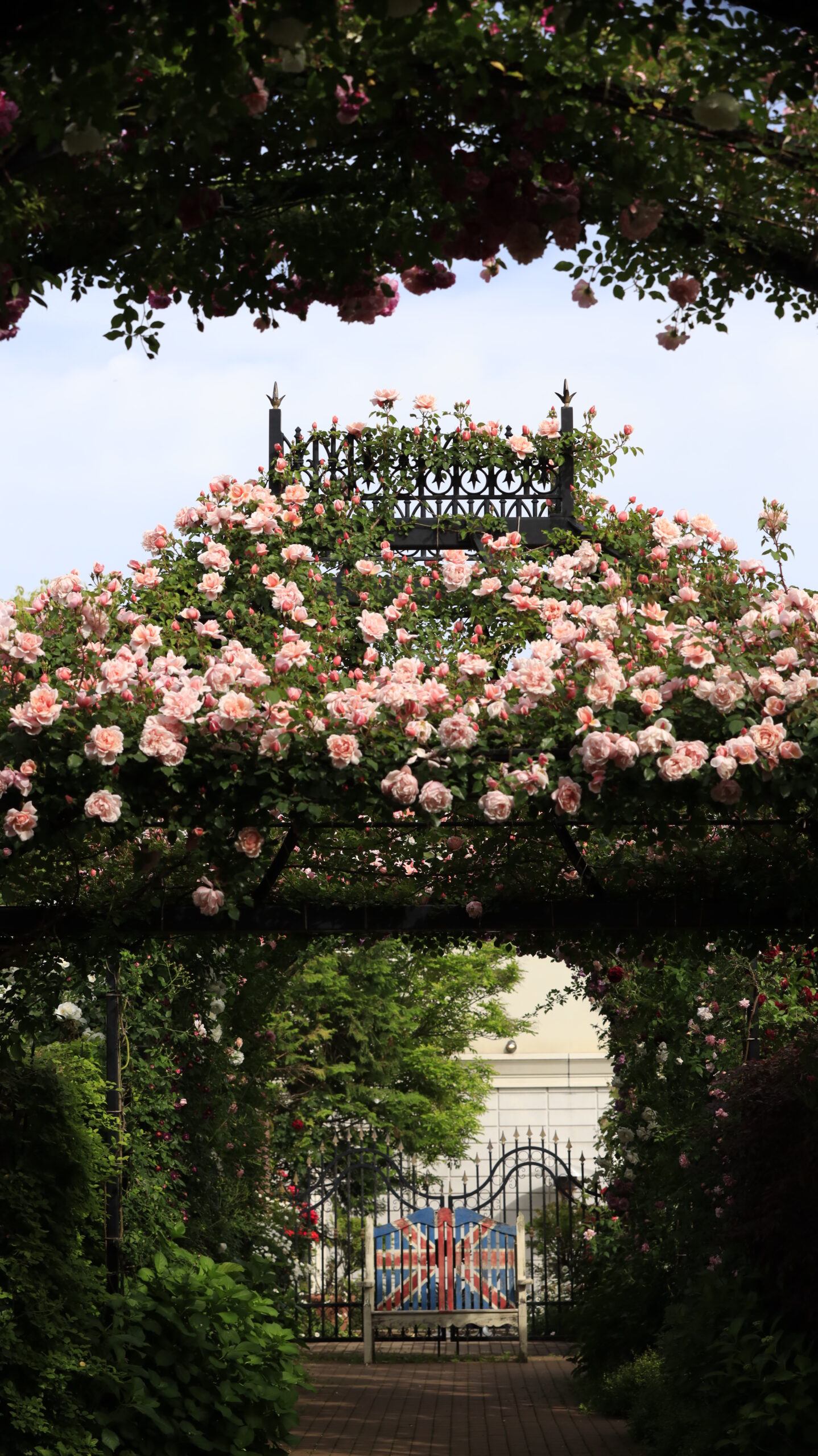 2025年 横浜イングリッシュガーデン|斜めから捉えたアーチの美 この写真は、横浜イングリッシュガーデンの入ってすぐの正面にあるアーチを、少し斜めの位置から整った構図で美しく撮影したものです。 2025年2025年5月5月横浜イングリッシュガーデン神奈川県花薔薇