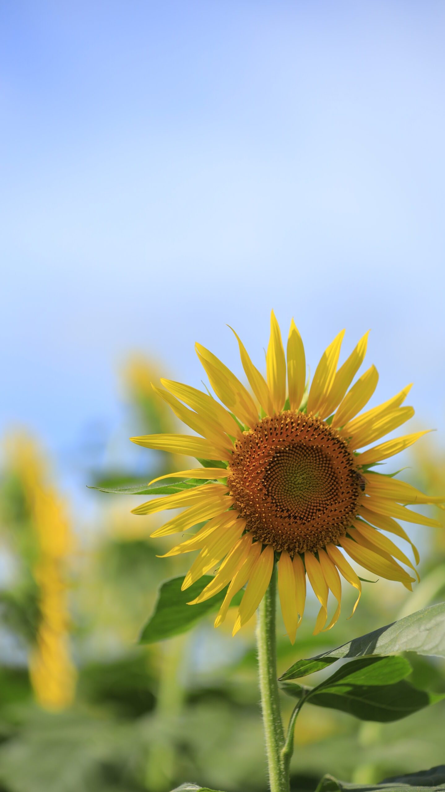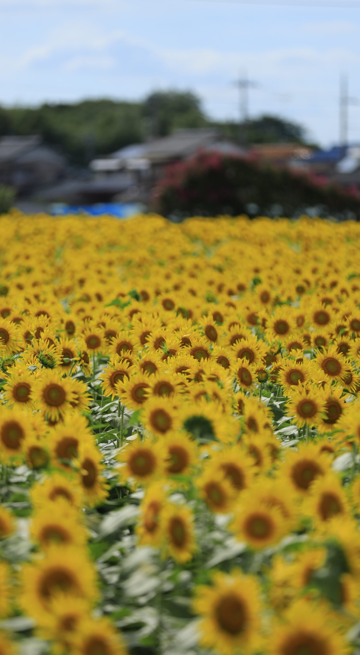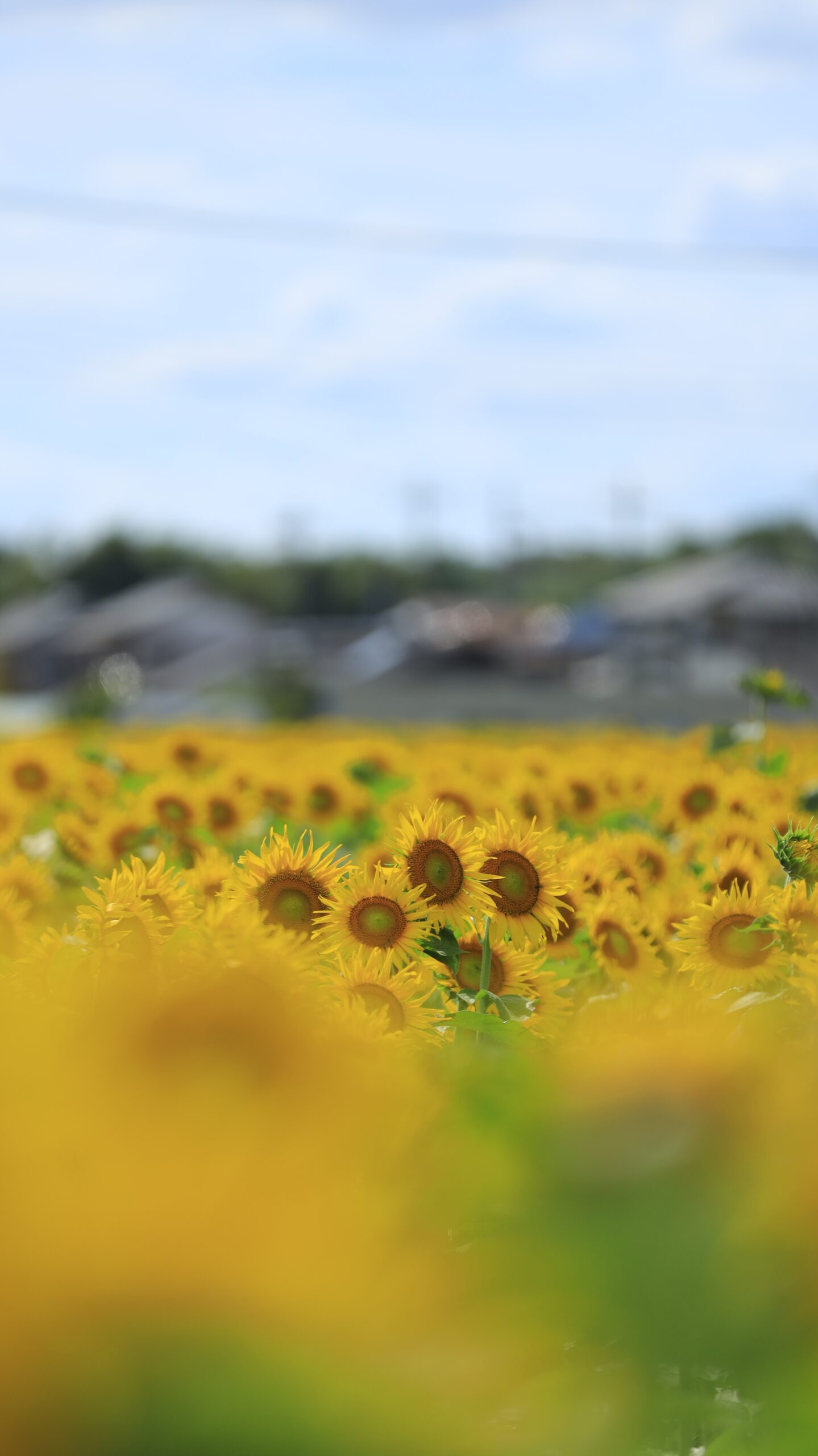 この写真は、野木町ひまわり畑で、風に揺れる向日葵を斜め下から見上げるように撮影し、花の動きと季節の空気感を表現したものです。