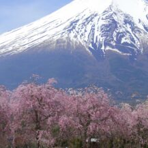 この写真は、富士本栖湖リゾート(富士芝桜まつり)で、早朝の澄んだ空気の中、藤の花と美しい富士山を組み合わせて静けさを感じる一枚として撮影したものです。