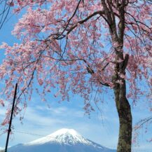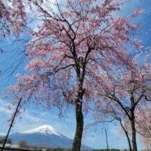 この写真は、山中湖花の都公園で、八重枝垂れ桜と富士山、そして抜けるような青空を組み合わせ、爽快感のある春景色として撮影したものです。