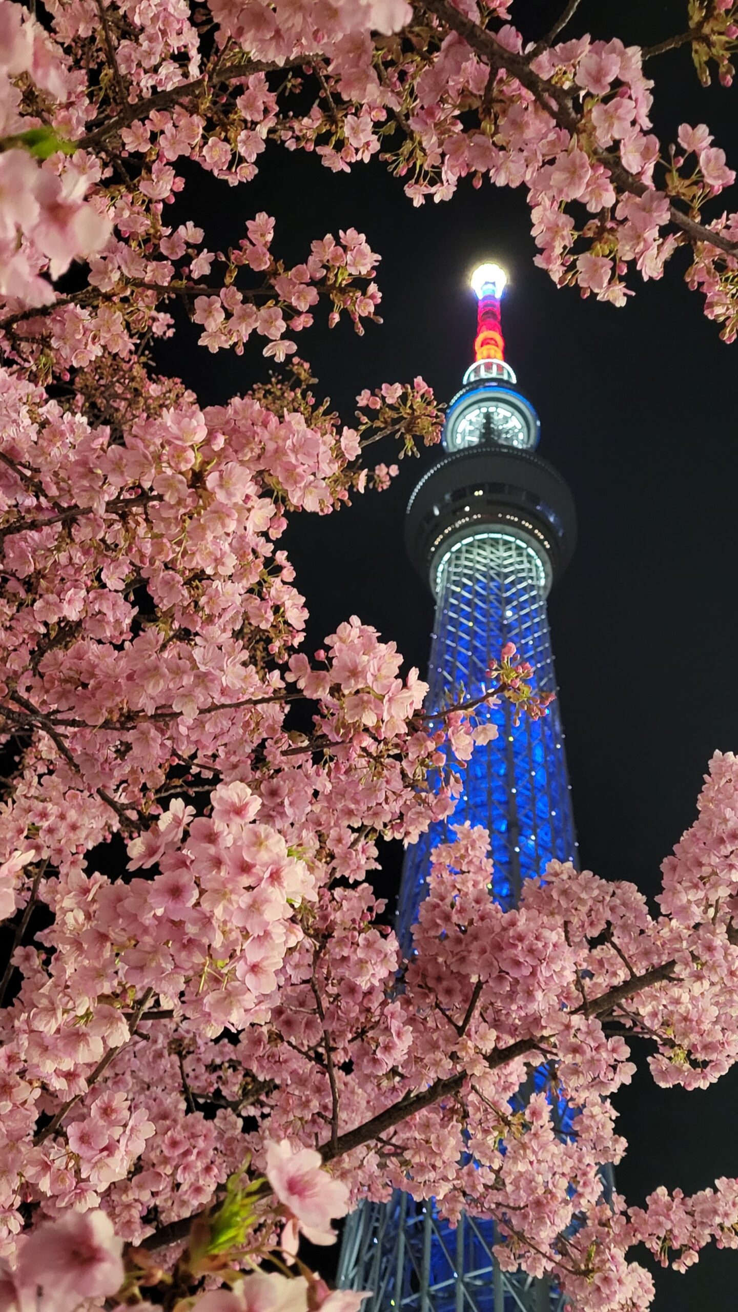この写真は、夕暮れから夜にかけて、スカイツリーがライトアップされたタイミングで桜の木と一緒に撮影しました。