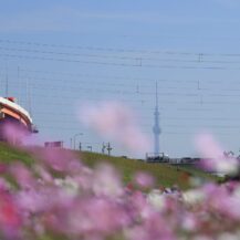 この写真は、足立区都市農業公園で、ピンクに輝くコスモス越しに遠くのスカイツリーを撮影したものです。