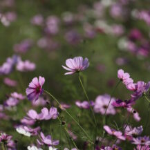 神川ゆ~ゆ~ランド|淡いオレンジ色の光に包まれるコスモスの朝